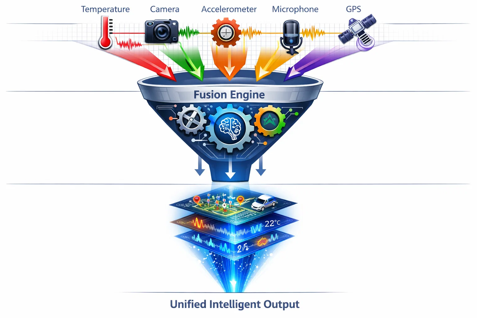 Modern AIoT devices don't just collect data from individual sensors—they perform intelligent fusion at the edge, combining multiple modalities to create comprehensive environmental understanding: