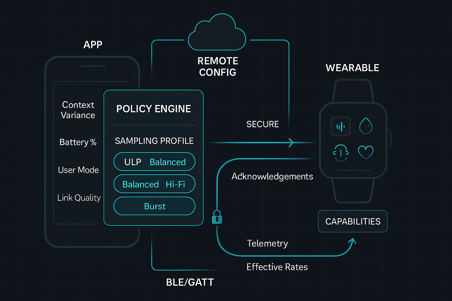 Adaptive sampling turns your wearable into a system that feels alive—delivering the right data at the right moment while preserving battery for when it matters. Instead of locking sensor rates in firmware, we set behavior at the app layer with a small, transparent policy engine. The device advertises capabilities; the app selects named profiles (ULP, Balanced, Hi-Fi, Burst) based on motion, battery, link quality, and user intent. This keeps firmware simple, makes iteration fast (via remote config/A/B), and aligns data fidelity with product goals—better models, longer life, happier users. In this post we’ll walk through the architecture, a declarative policy table, burst capture around key moments, observability that guides tuning, and rollout patterns that teams can adopt quickly across wearables, pet tech, and sensor-rich IoT.
