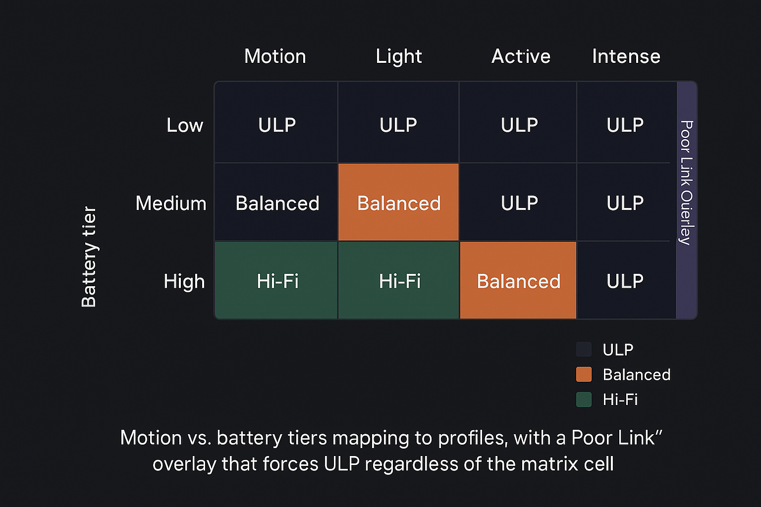 - Fitness wearables: Hi-Fi during structured workouts; Burst on sprints; ULP for desk hours; Balanced for casual walks.