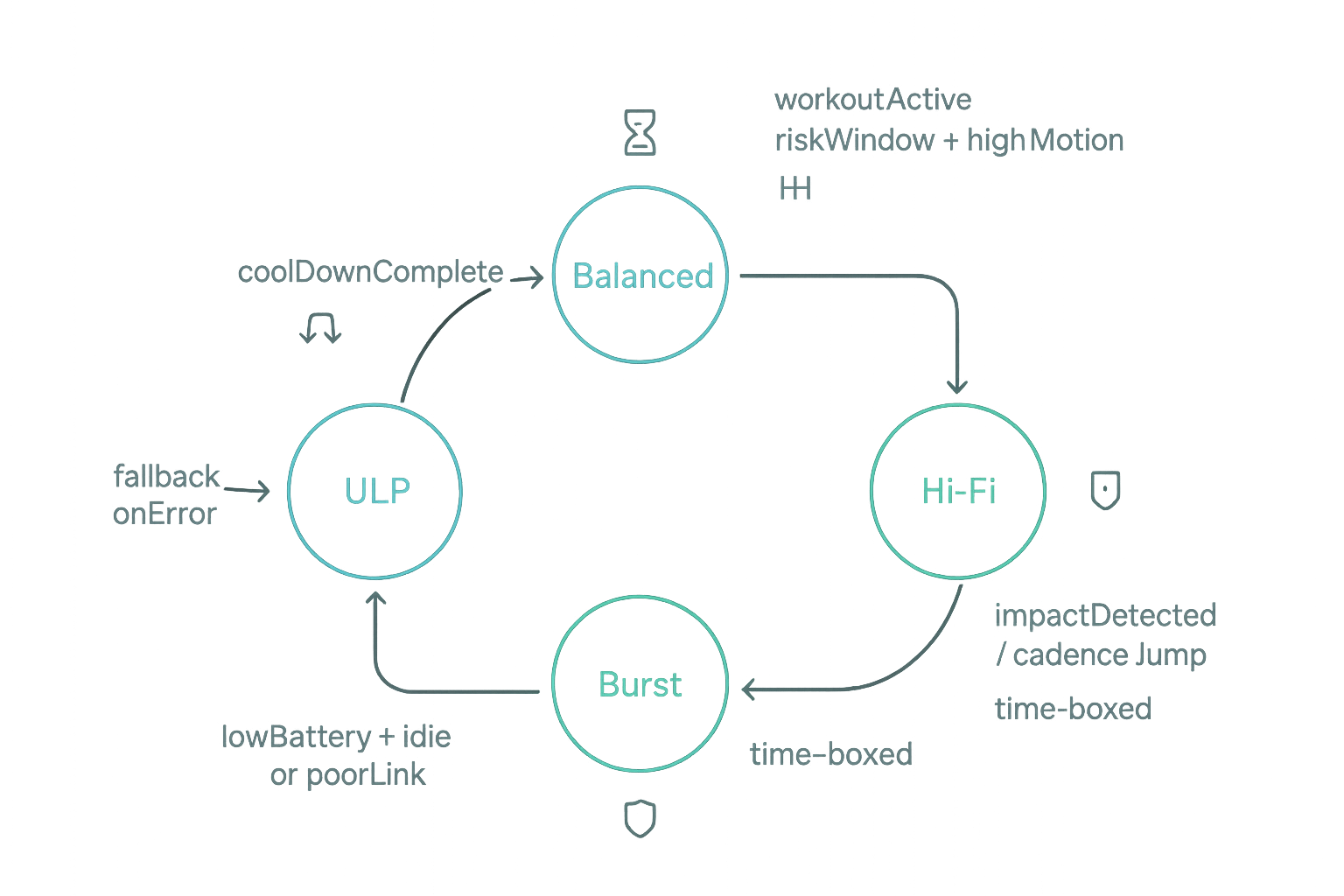 - Safety pendants: Stay in Balanced/ULP; Burst on high impulse + orientation change; escalate to Hi-Fi on persistent activity.