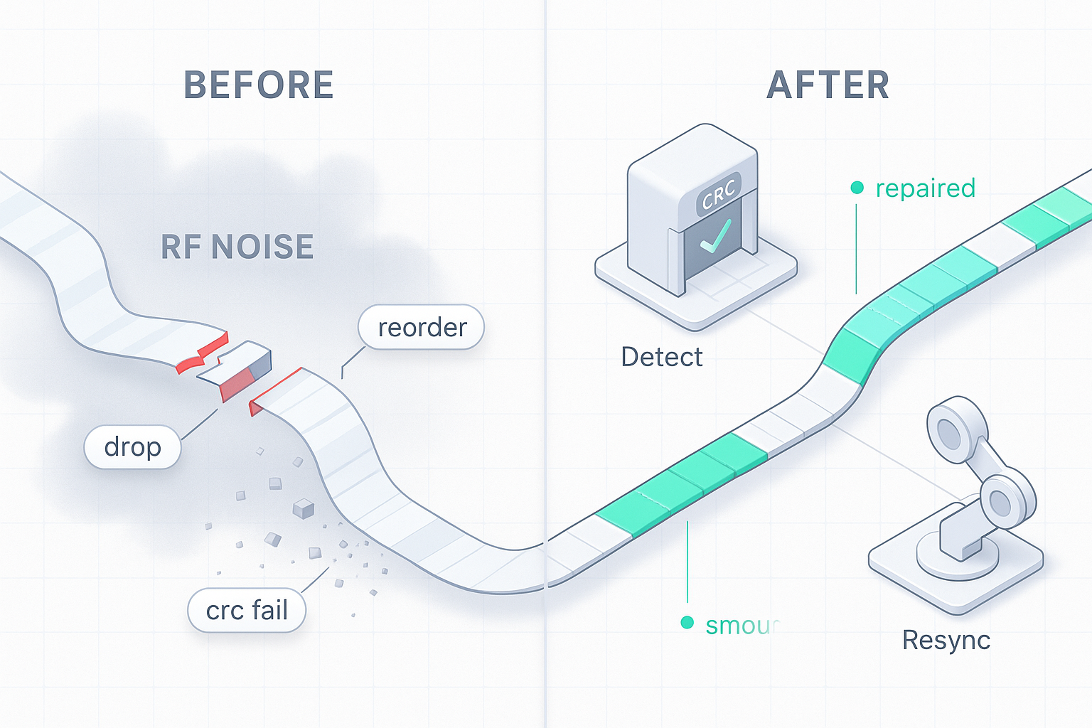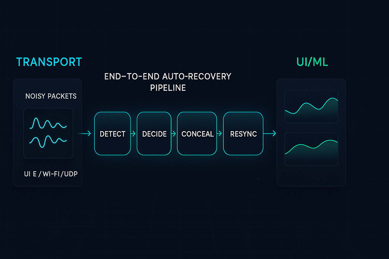 Networks misbehave in the real world. BLE links jitter, Wi-Fi bursts collide, buffers overflow, and low-power sensors occasionally flip a bit. The worst part isn’t the packet loss—it’s the visible glitch your user sees: a frozen chart, a jumpy graph, or a dropped audio blip. This post shows how to build an auto-recovery pipeline that quietly detects corruption, drops the bad data, resynchronizes in milliseconds, and conceals the failure so the experience stays smooth. We’ll follow a practical deep dive (Problem → Approach → Process → Results → Takeaways) with tiny, copy-pasteable snippets, production-ready diagrams you can recreate, and pragmatic defaults that work on constrained MCUs and mobile apps alike.
