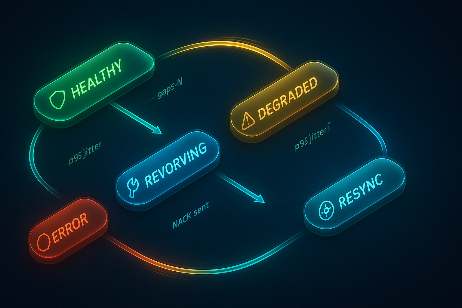 - Guardrails: cap retries per window, auto-promote to RESYNC after K attempts, and never block playout.