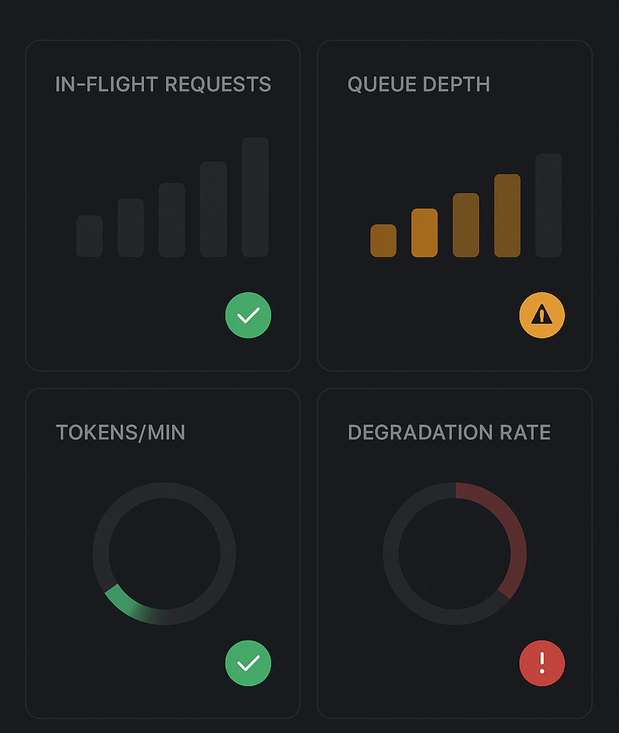 Expose metrics for queue depth, in-flight requests, tokens/min, and degradation decisions; build a simple dashboard so the team can actually see backpressure in action.