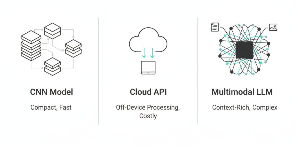 We evaluated three distinct approaches for image-based breed detection, each with different architectural philosophies and operational tradeoffs.