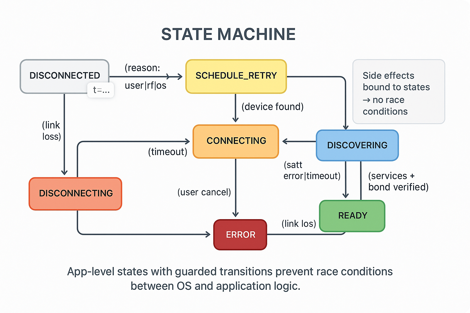 Race conditions – Your app's connection state fights with iOS CoreBluetooth or Android's GATT stack. Attempting reconnection while the OS is still cleaning up creates ghost connections where your app thinks it's connected but can't read services.