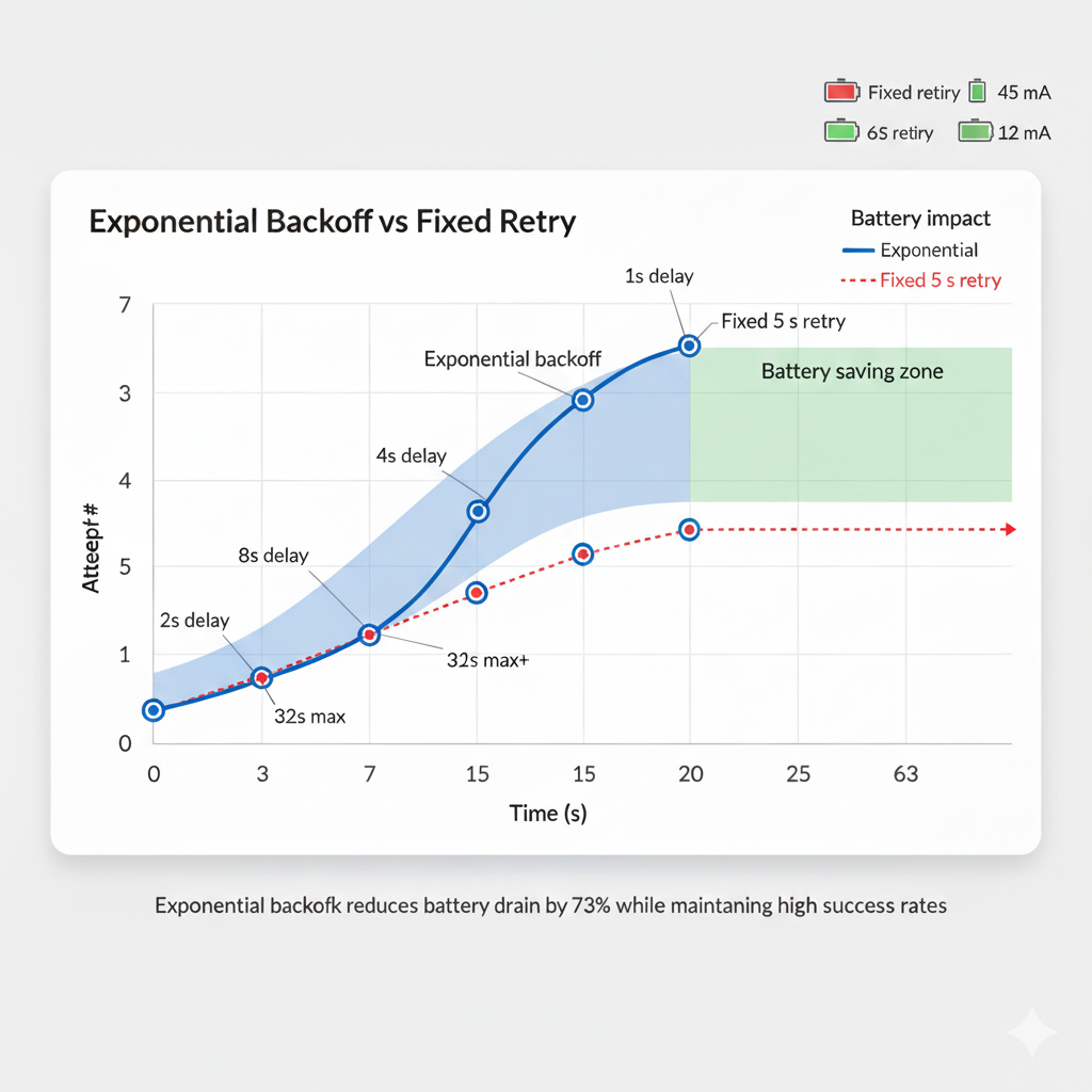 Battery drain – Fixed-interval retries at 5-second intervals consume 40-60 mA continuously. Your "all-day battery" device dies in 6 hours.