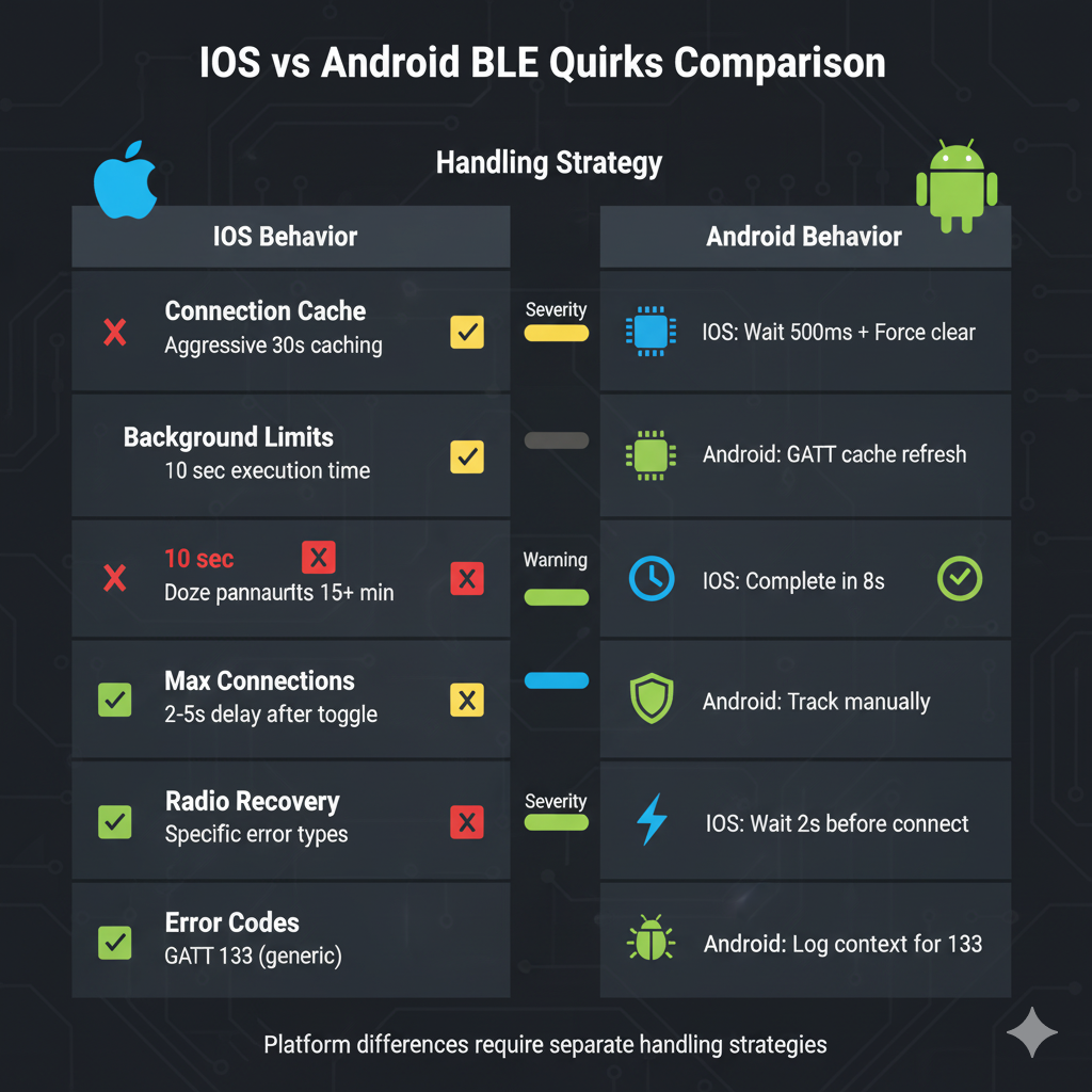 iOS CoreBluetooth and Android GATT have different timing requirements, different failure modes, and different background scheduling behaviors. Respect those differences. Clean up state properly. Give the OS time to process your cancellations before retrying.