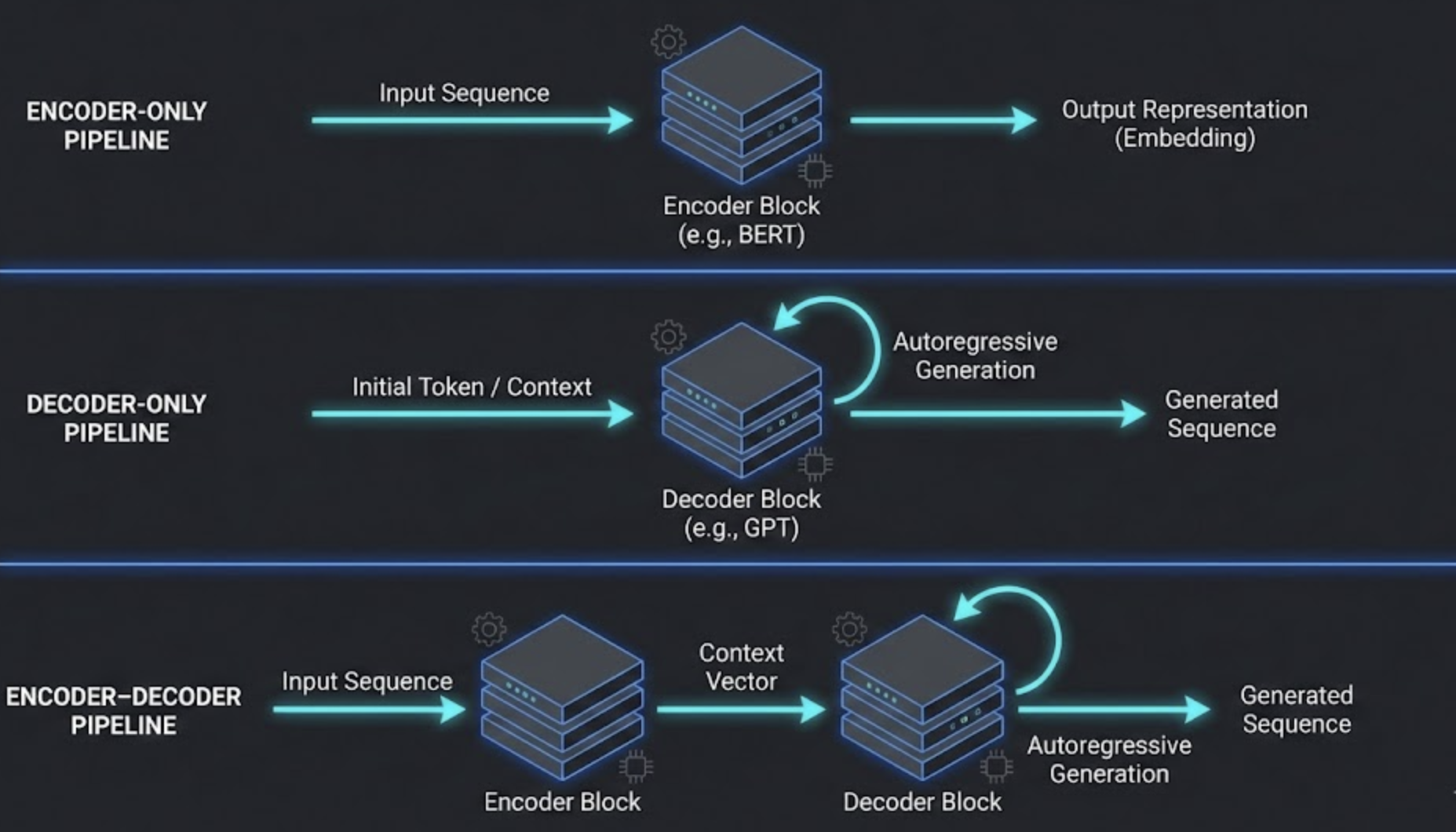 Decoder‑only → reasoning + generation