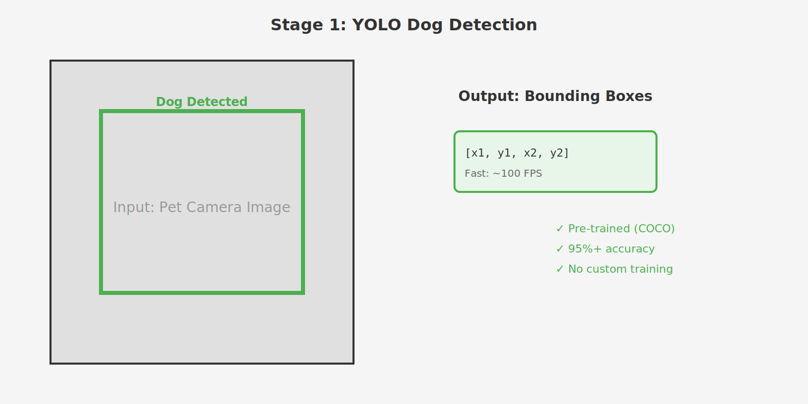 YOLO (You Only Look Once) is extremely fast and accurate for dog detection. Using the pre-trained COCO weights, we can detect dogs at ~100+ FPS with 95%+ accuracy on pet camera images. This first stage provides tight bounding boxes around dog bodies, which become the spatial filter for the next stage.