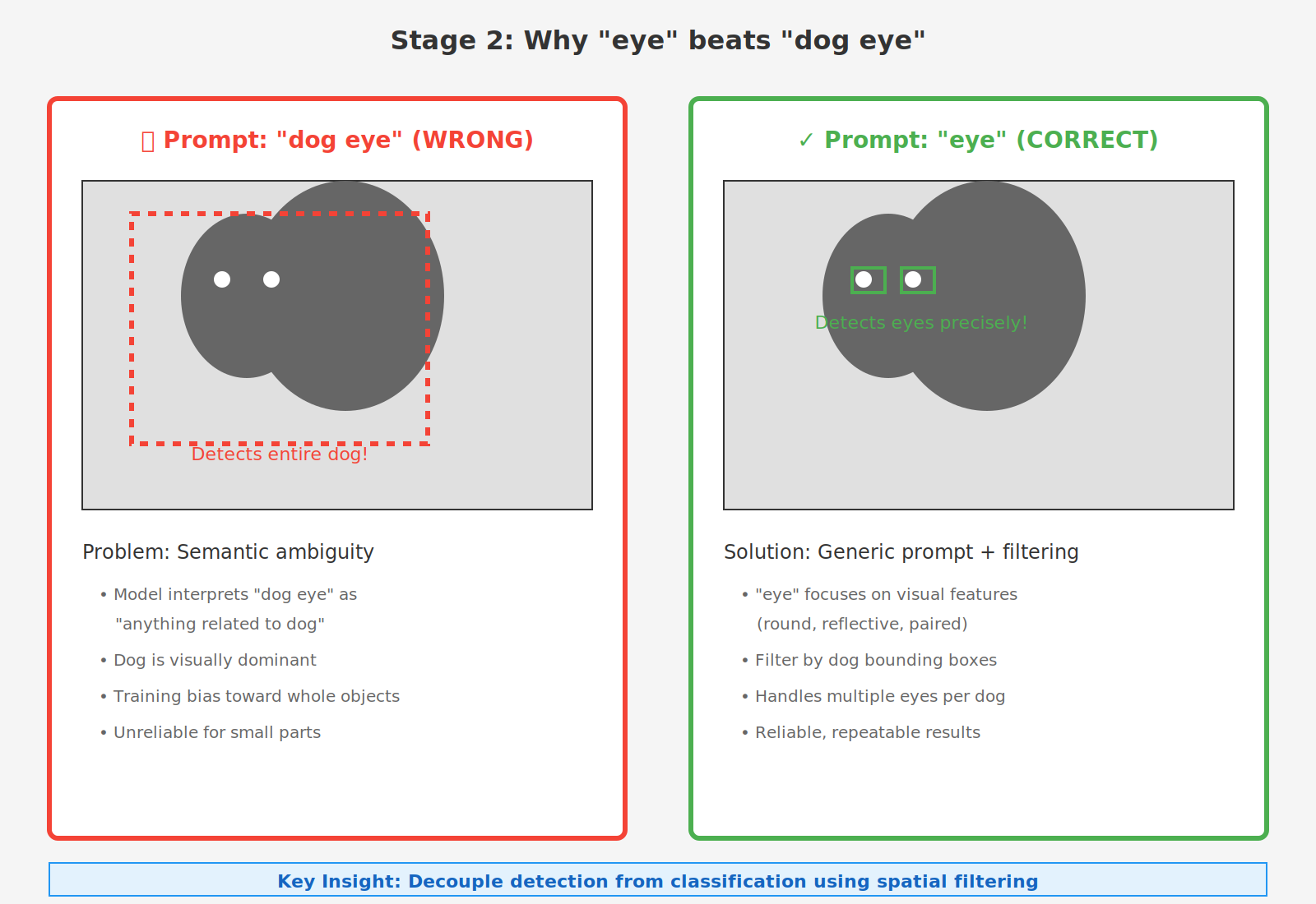The diagram above shows the stark difference: "dog eye" leads to whole-dog detections due to semantic ambiguity, while the generic "eye" prompt combined with spatial filtering gives us precise eye locations.