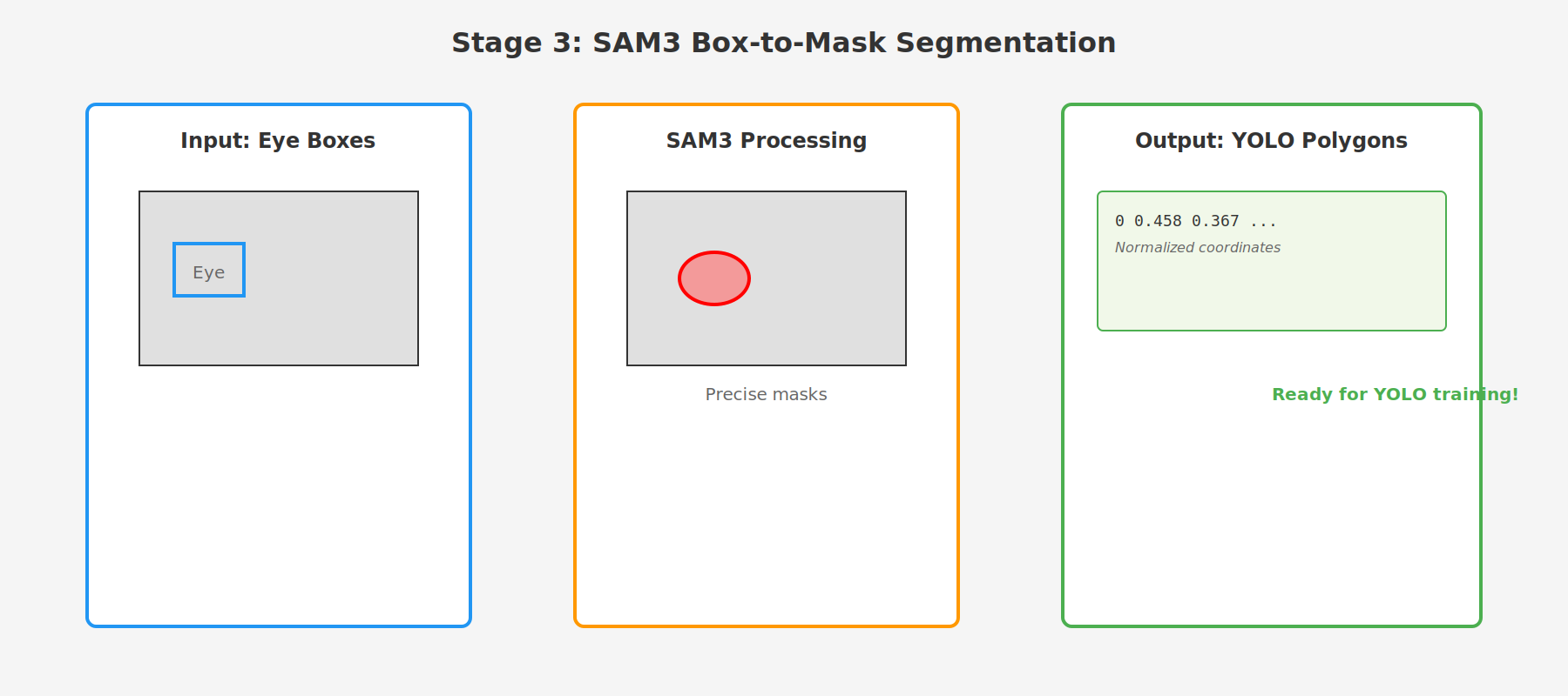 SAM (Segment Anything Model) is the state-of-the-art for segmentation. By providing it with the eye bounding boxes from Stage 2, SAM generates precise pixel-level masks that accurately outline each eye. These masks are then converted to polygon format suitable for YOLO training.