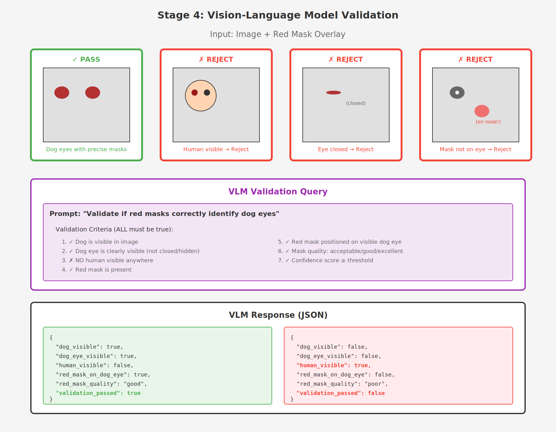 The VLM receives the image with red mask overlay and validates whether the masks correctly identify dog eyes. It checks multiple criteria: