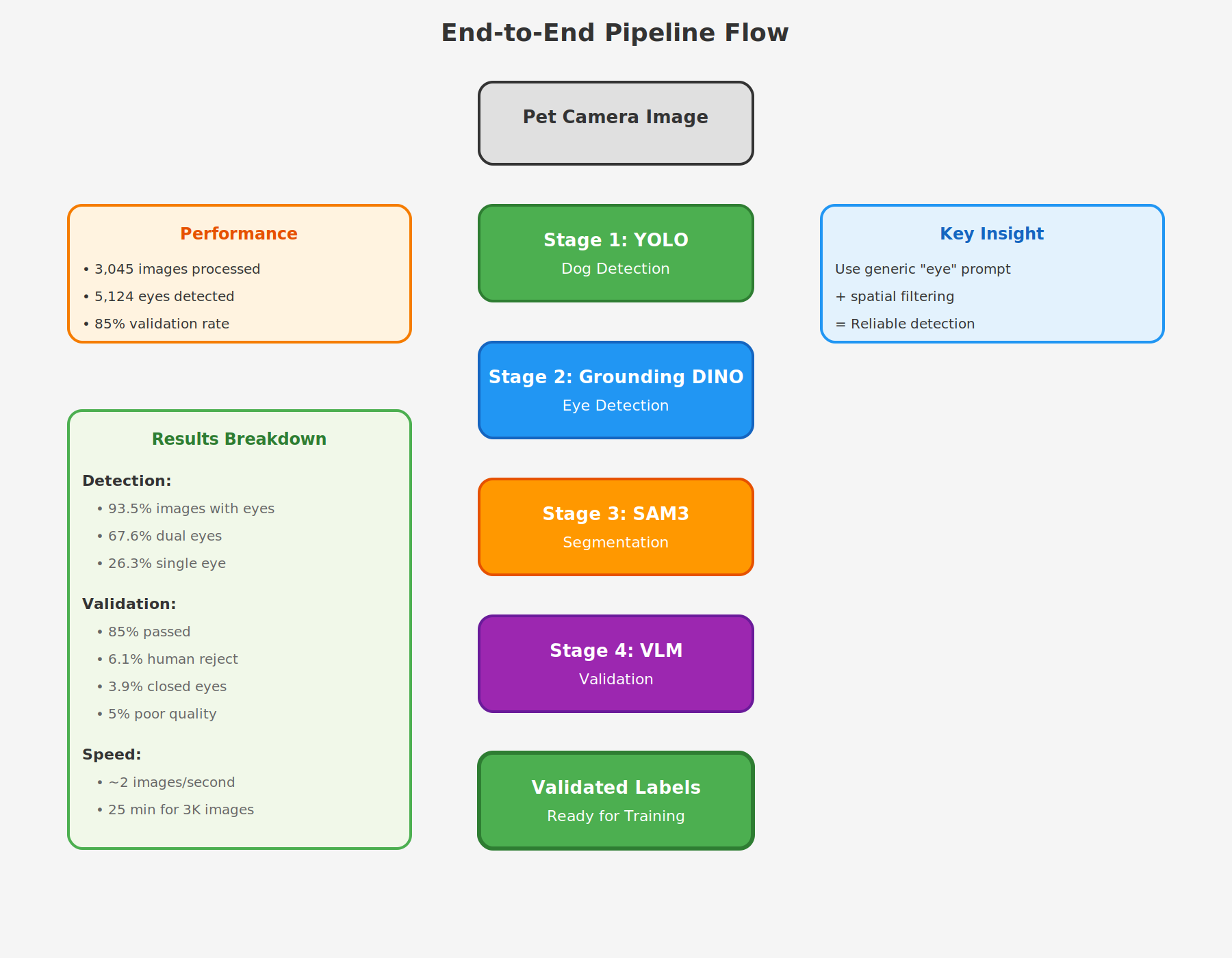First, let's back up to why we built this pipeline in the first place. The obvious approach seemed simple: use a state-of-the-art object detection model with the prompt "dog eye" and call it a day. But reality had other plans.