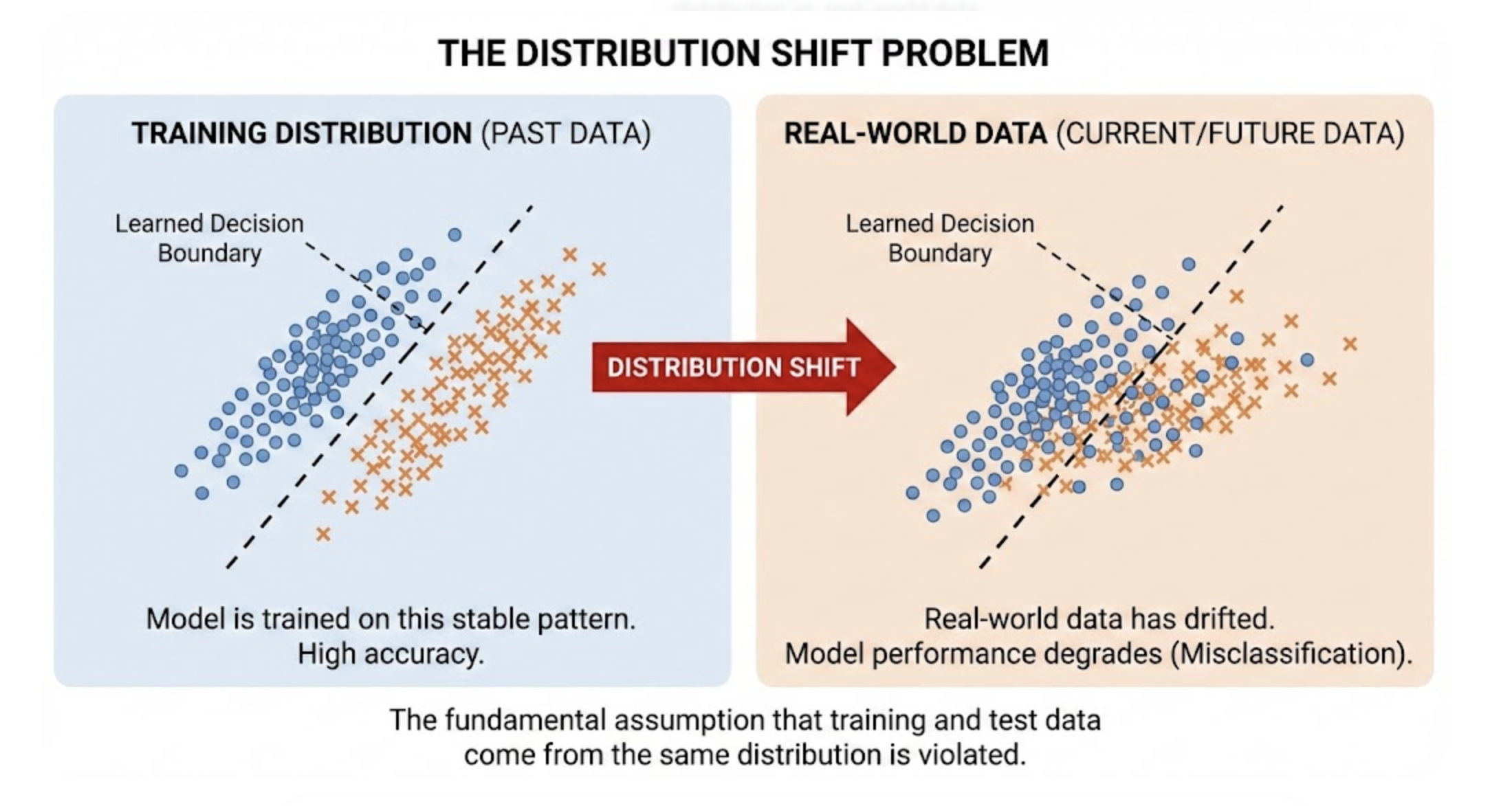A one‑time training run can only capture a fraction of the real world. Over time, this leads to: