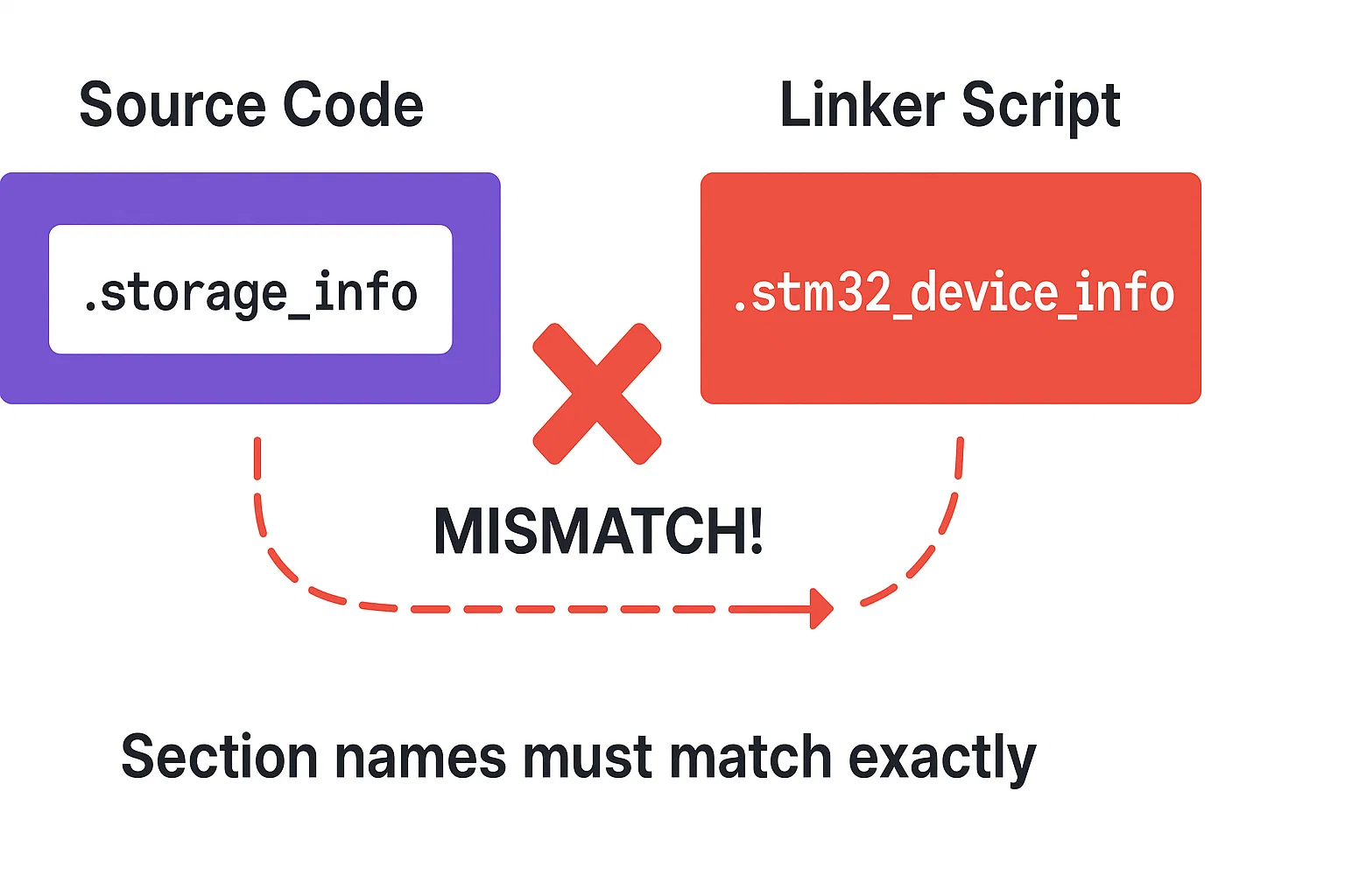 The root cause was a section name mismatch. The StorageInfo structure was placed in the .storage_info section, but the linker script was looking for .stm32_device_info.