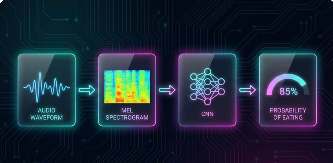 Eating sounds contain bursts, crunches, and rhythmic textures. A small CNN excels here-lightweight, edge-friendly.