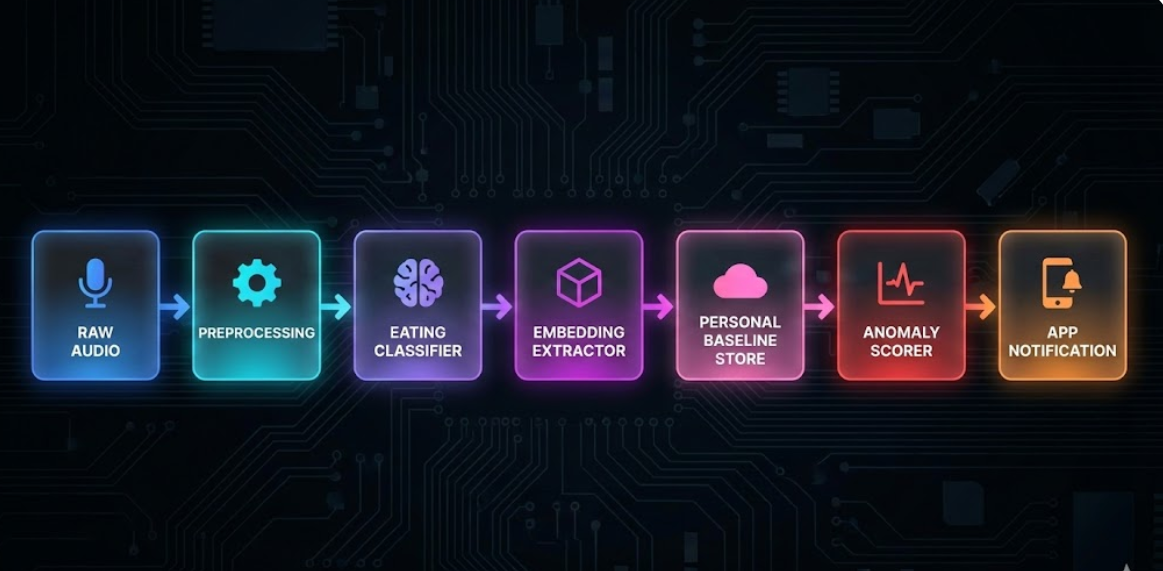 Within Hoomanely’s ecosystem, this pipeline supports early detection of unusual eating events - hesitation, rapid eating, or sudden pauses. While the blog keeps things generic, the internal system integrates audio anomaly scores with EverSense depth sensing and EverBowl eating logs, creating a multi-modal health profile.