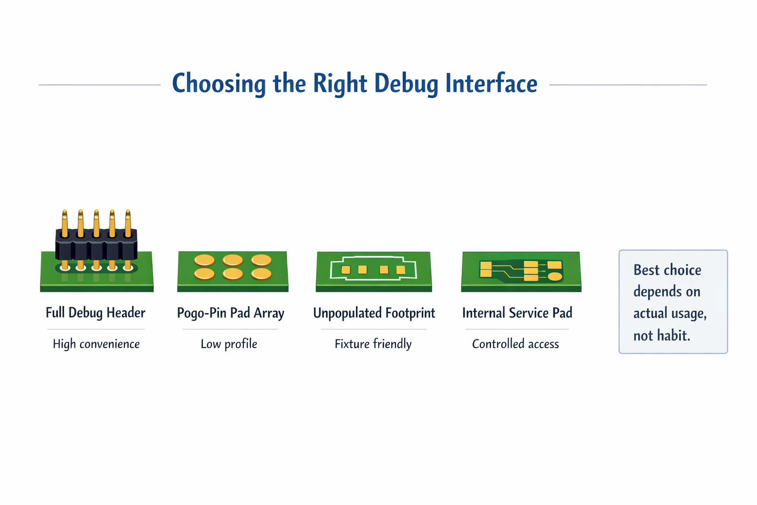 If an interface is mainly used in bring-up or fixture programming, a clean pad array may be the better choice. It still gives access, but without turning the board into a permanent development platform.