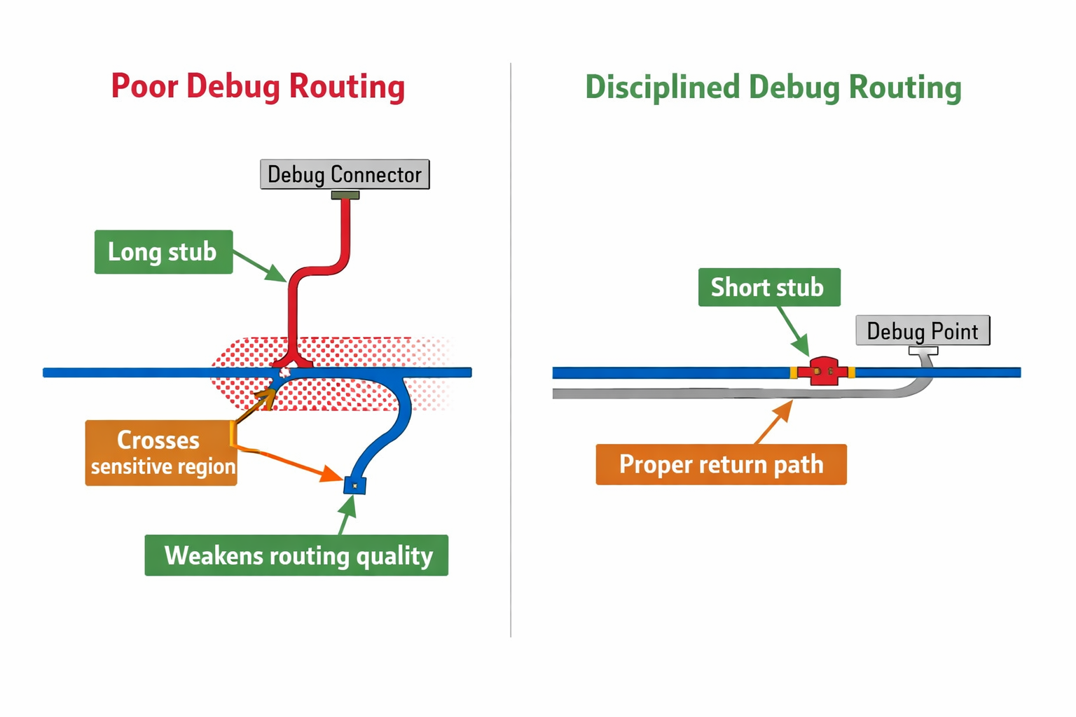 Debug routing is often treated casually because these signals are “only for development.”
