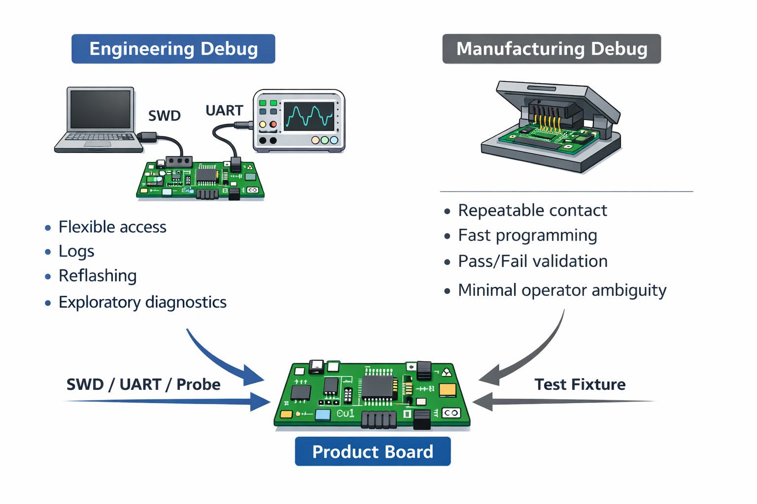 One mistake many boards make is trying to use the exact same debug pathway for both engineers and manufacturing.