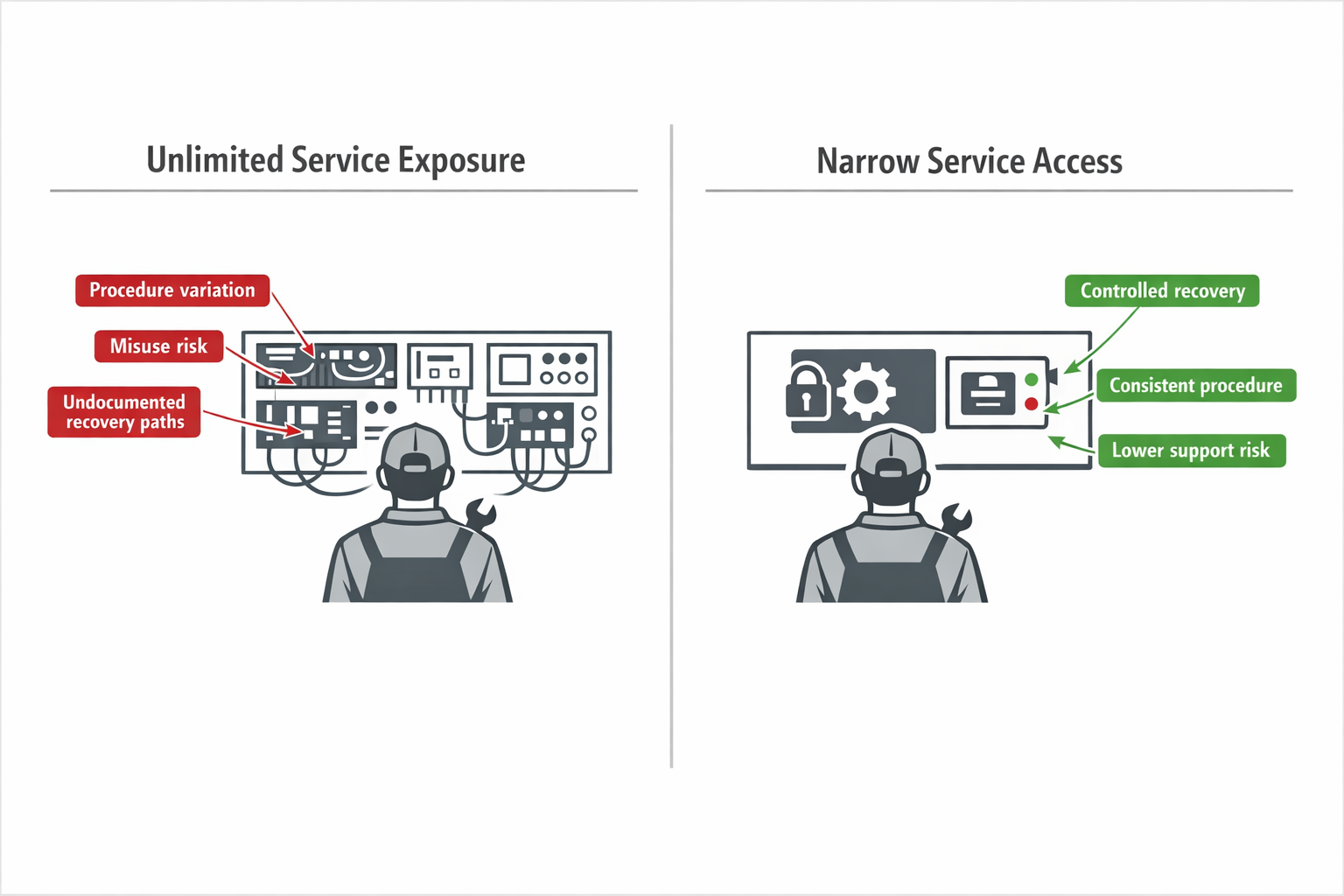This is where too much debug access becomes dangerous. If service can touch every low-level interface, procedures become inconsistent and error-prone.