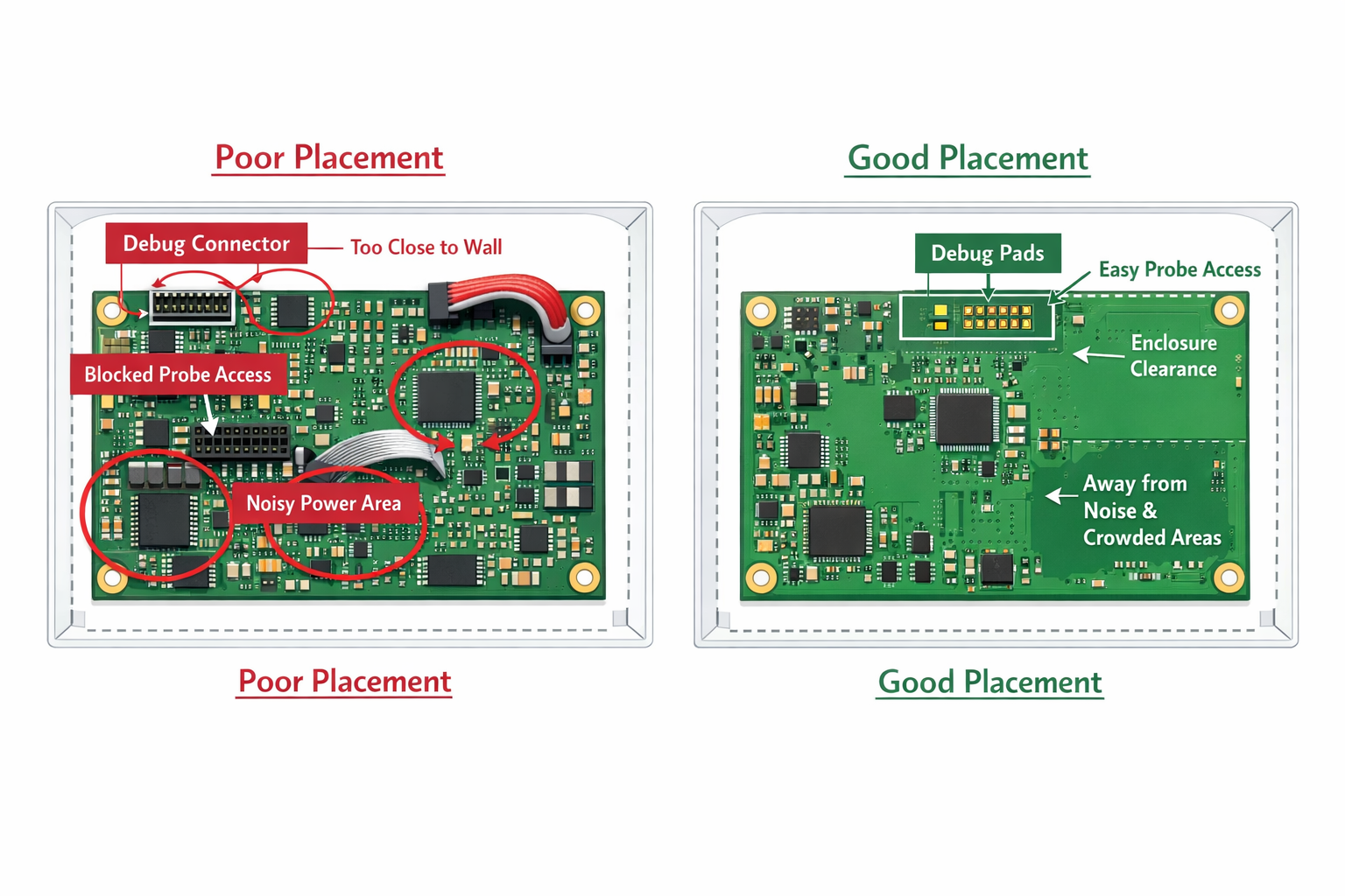 Even if the electrical design is correct, poor physical placement can still make debug access a liability.