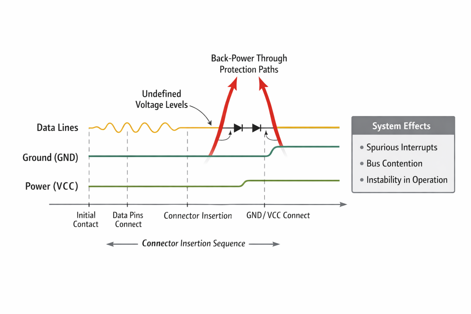 When connectors are inserted under load, ground potential differences can create momentary shifts in reference.