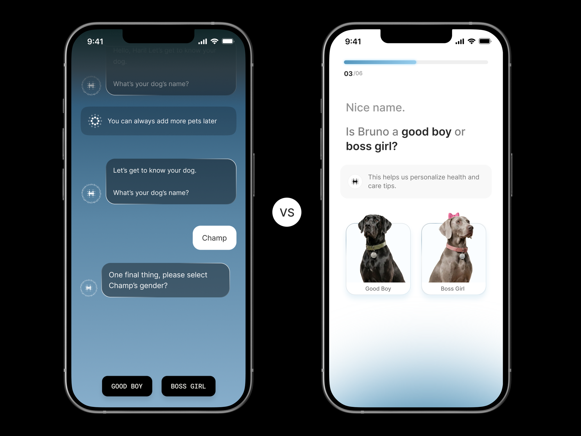 The original onboarding flow was designed to feel friendly. We framed it as a conversational, chat-style experience almost like talking to an AI assistant. One question appeared at a time. The system asked for the pet’s name, then prompted users to upload a photo to analyse the breed using AI. If the model couldn’t confidently identify the breed, we asked users to type it manually. We followed that with chat-style insights about the breed, then continued with date of birth, weight, and medical conditions.
