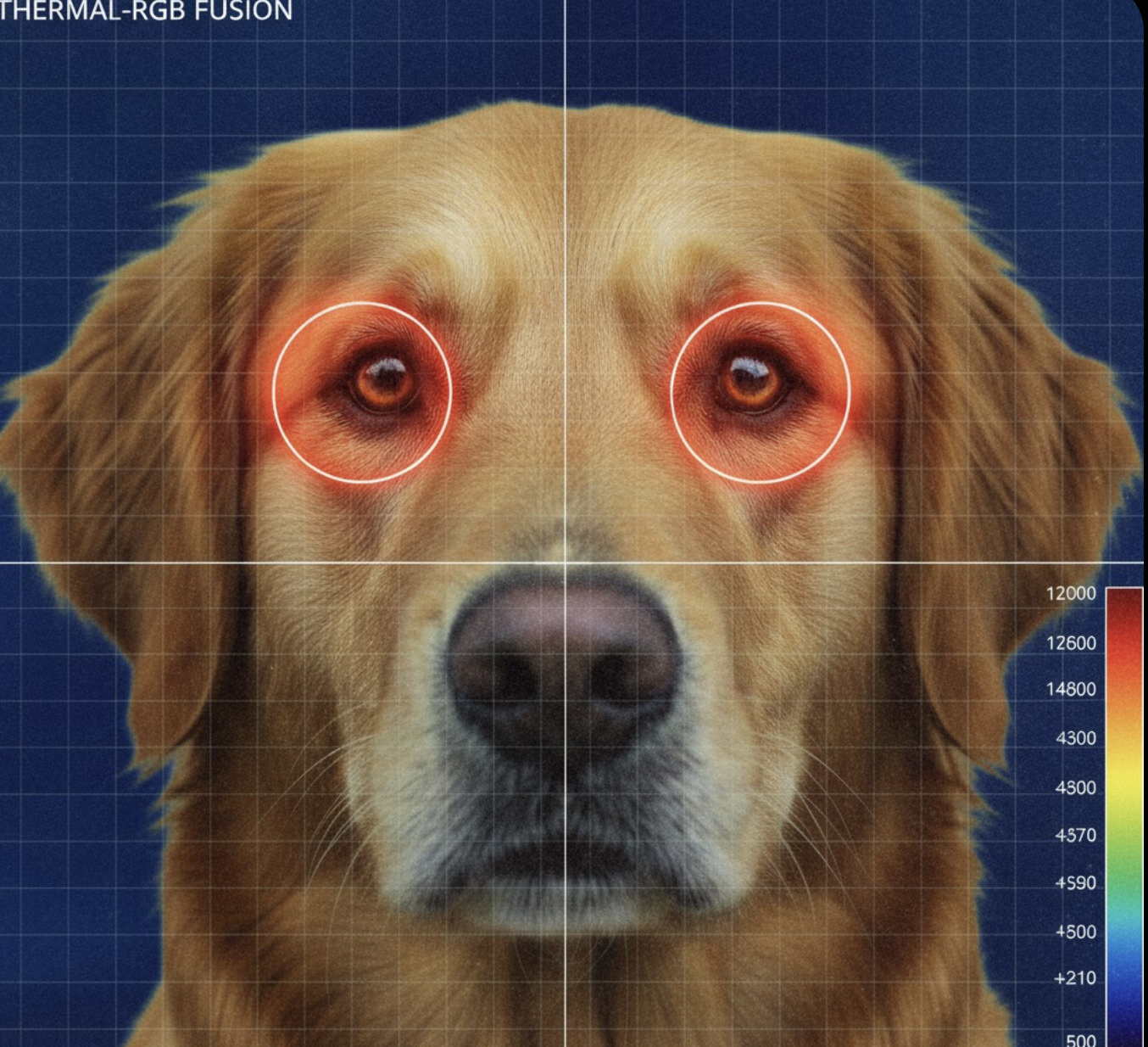 At 30–50 cm distance, small geometric errors translate into large thermal overlay shifts. A 3–4 cm depth misestimate can move the projected thermal blob several pixels — enough to shift from cornea to snout.