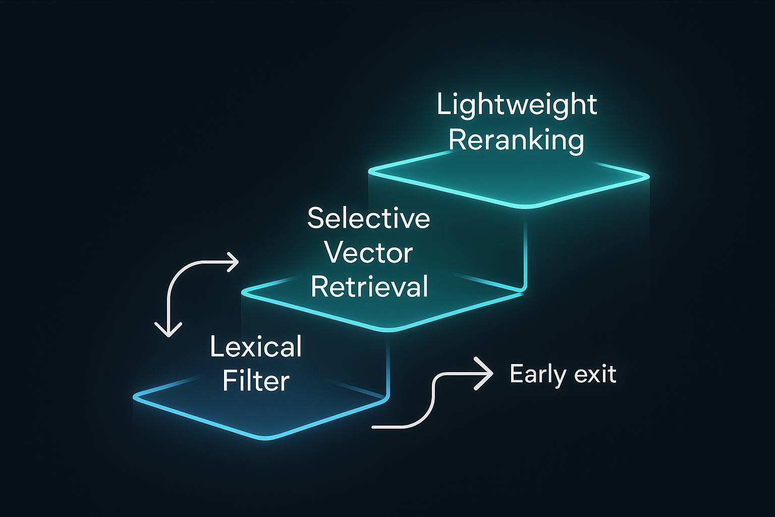 Once the candidate set is created, a selective vector search may run on this smaller pool rather than across the entire index. This combination avoids global vector search, keeps traffic localized, and dramatically reduces latency variance. If the query appears straightforward or if the lexical signals already produce strong candidates, deeper semantic search may be skipped entirely.