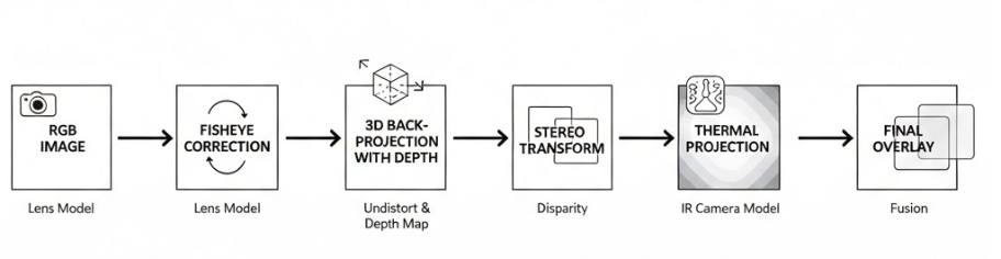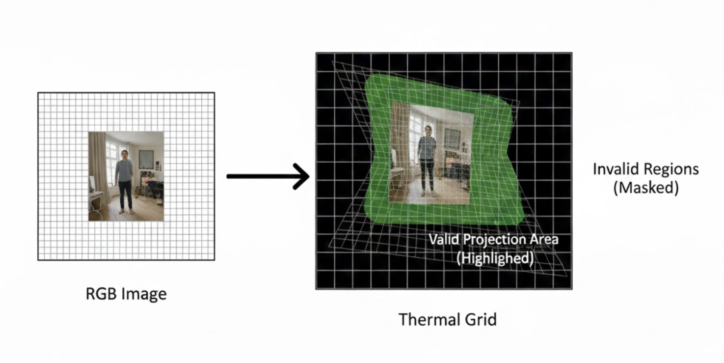 - Geometric mapping from RGB pixels → thermal pixels using depth