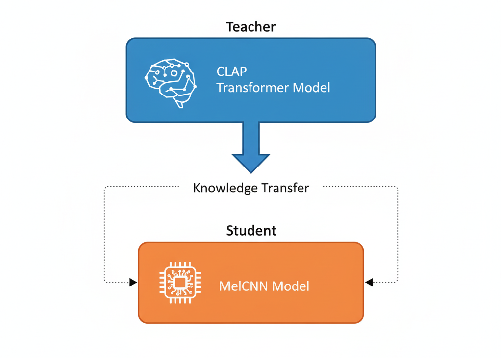 We designed a knowledge distillation pipeline using CLAP (Contrastive Language-Audio Pretraining) as our teacher model and a custom MelCNN as our student model for edge deployment.