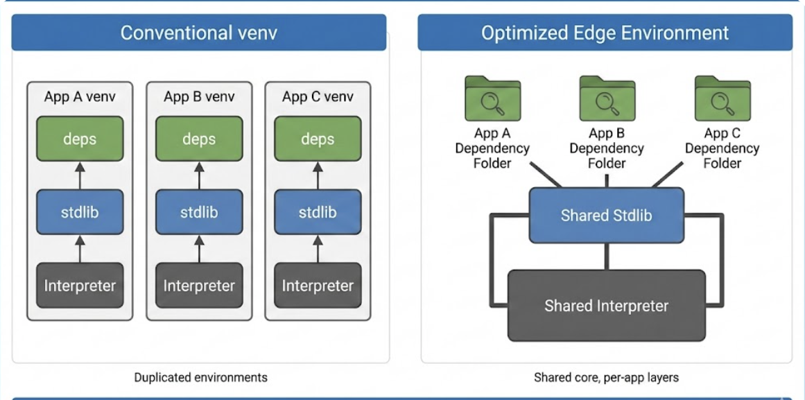 A conventional python -m venv virtual environment frequently consumes 300–600MB, creating unnecessary duplication of interpreters, standard libraries, and dependency trees. For edge systems, this is neither efficient nor sustainable. This article presents a structured, professional evaluation of production‑grade alternatives to Python virtual environments, followed by the solution architecture that best meets the constraints of modern edge deployments.