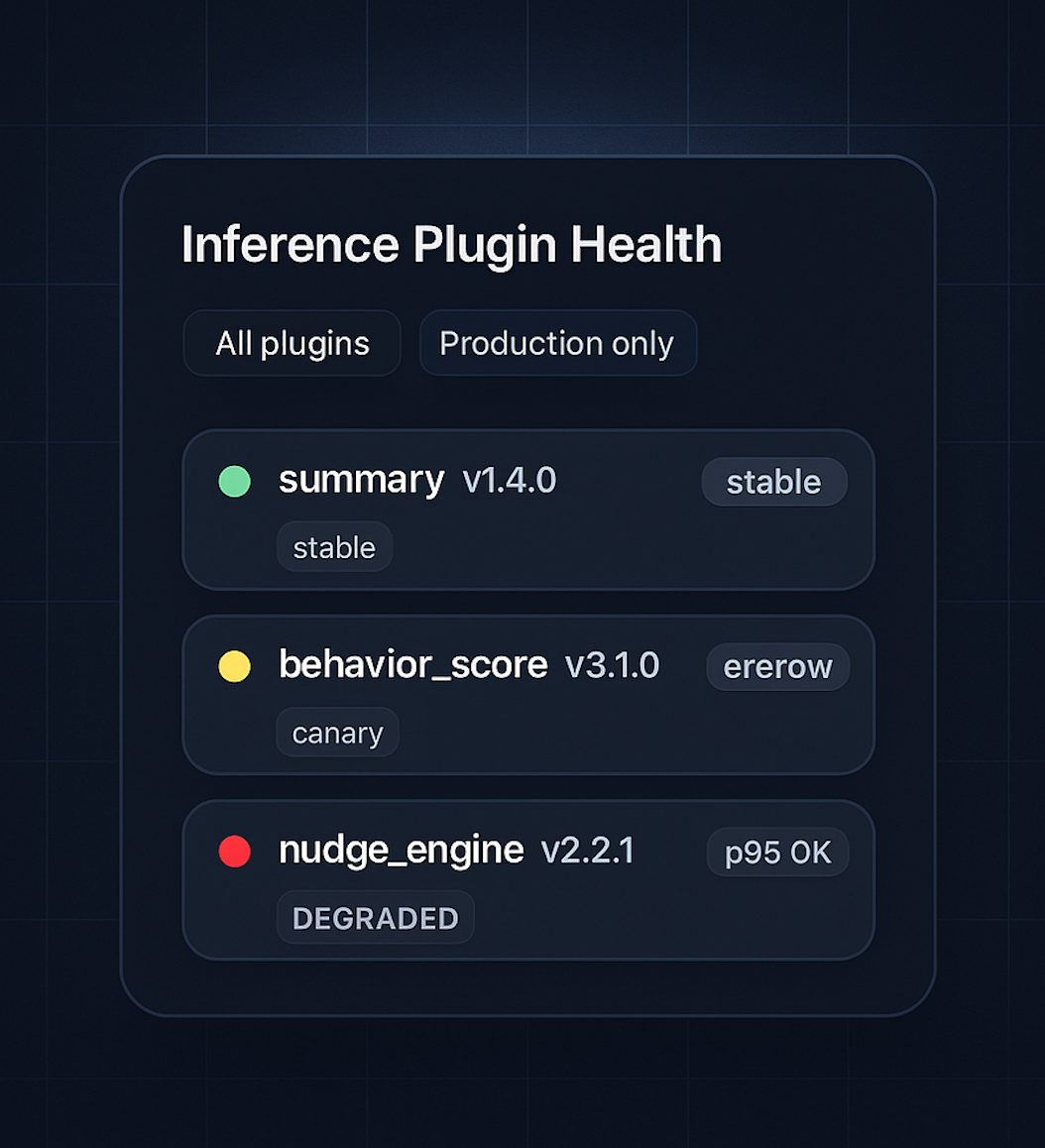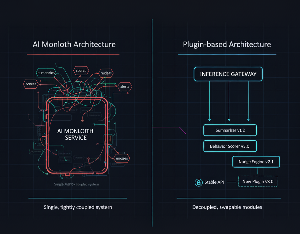 Instead of treating “AI” as a monolithic service, you can treat each inference task as a plugin: a small, self-contained module with its own routes, lifecycle, config, and tests. Need to try a new behavior scorer? Drop in a new module, register it, point a feature flag at it, and roll back in seconds if needed—without touching the rest of your backend.