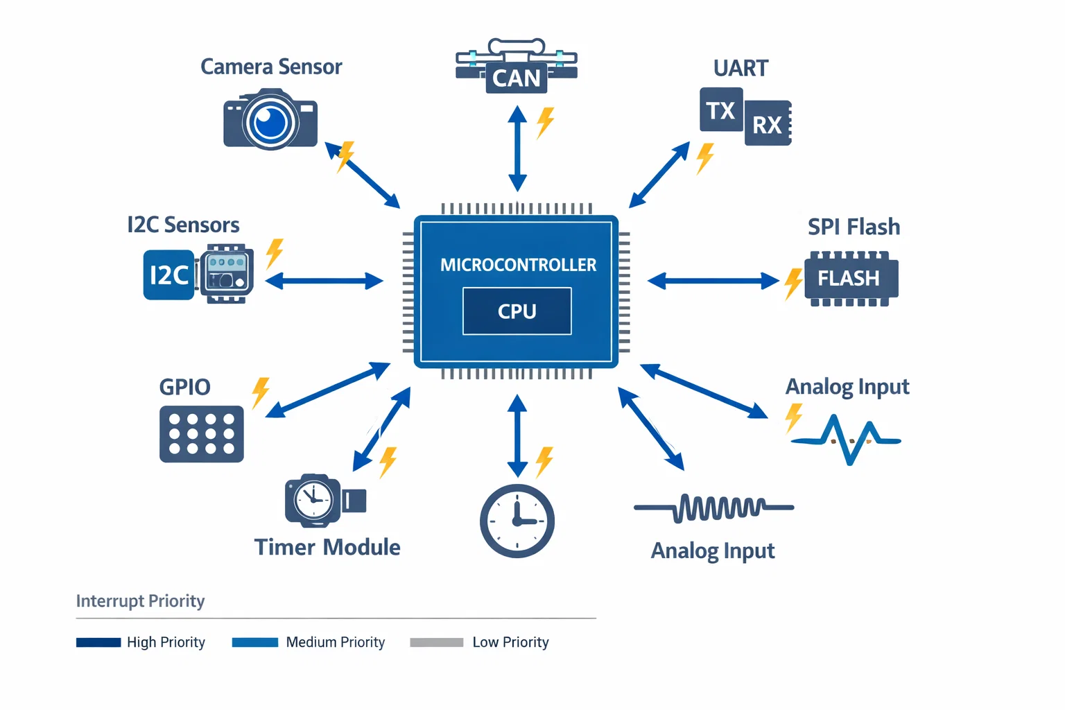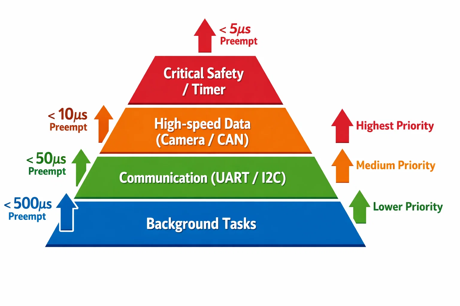 Critical peripherals get higher priority levels, ensuring time-sensitive operations never wait.