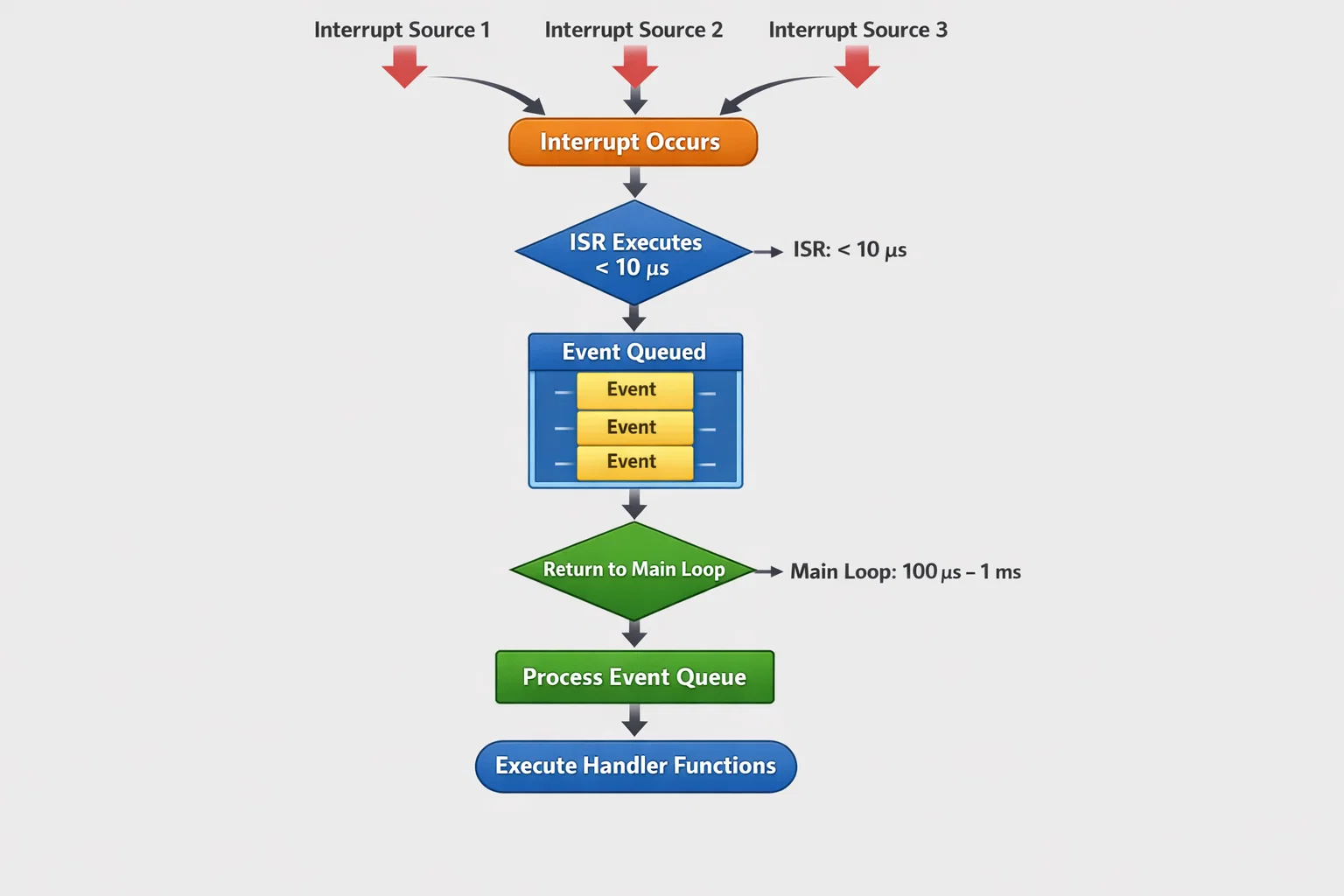 The naive approach—handling everything in a main loop—fails spectacularly. Critical events get missed, timing becomes unpredictable, and the system becomes unreliable under load.
