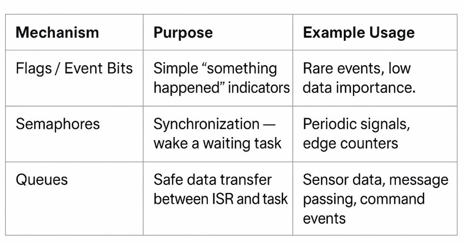 But ISRs should be fast, lightweight, and non-blocking — they exist to acknowledge the event, not to process it. That means most real work must be handed off to background tasks.Concept: What Is ISR-Task Communication?