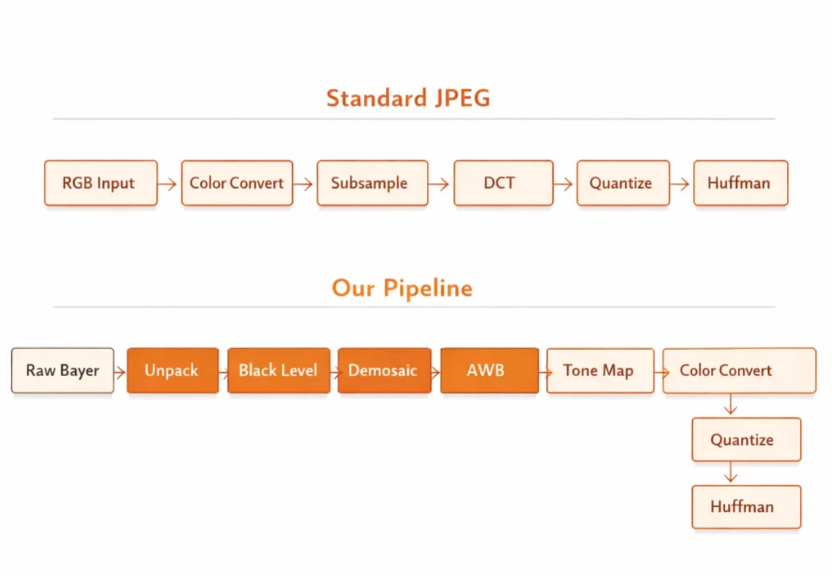 Raw Bayer → Unpack → Black Level → Demosaic → White Balance → Tone Map → Color Convert → DCT → Quantize → Huffman
