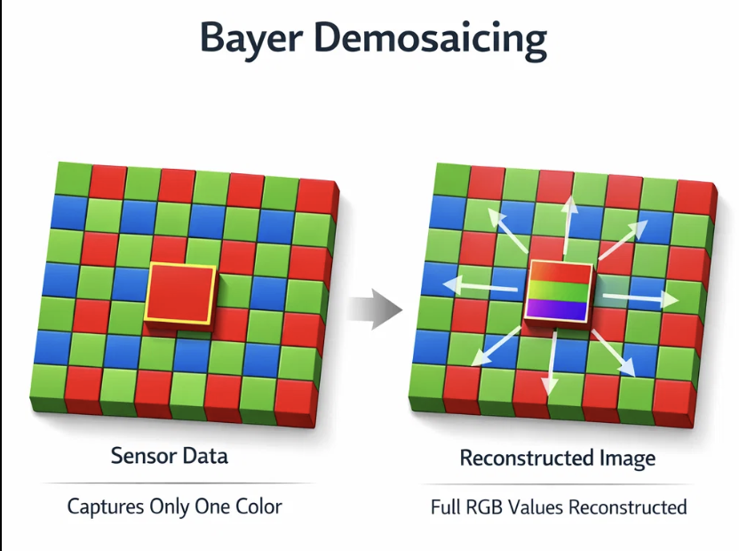Because each Bayer pixel contains only one color component, demosaicing is required to reconstruct full RGB values.