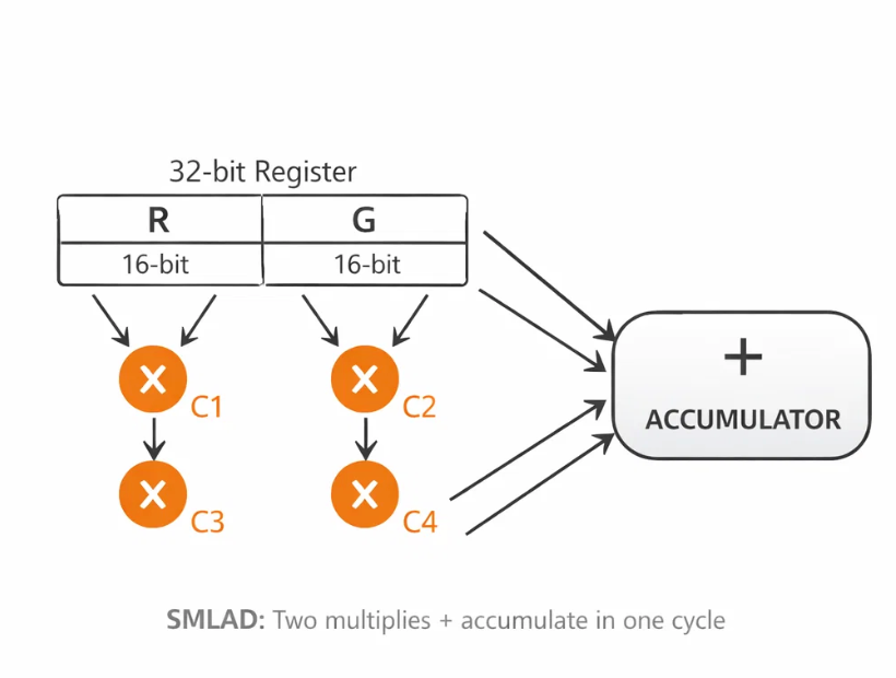 The Cortex-M33 provides DSP instructions such as SMLAD, which can perform two 16-bit multiplications and an accumulation in a single cycle.