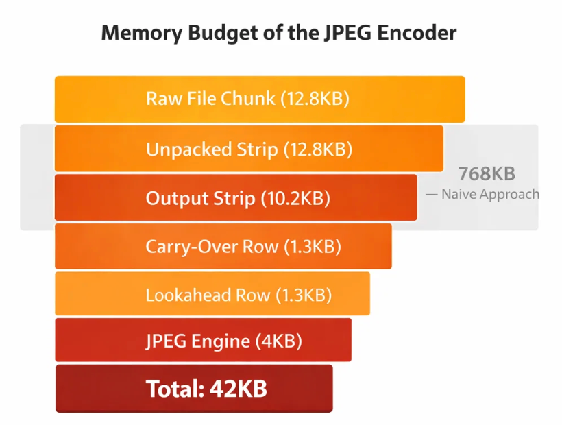On a microcontroller with 42KB of heap, no hardware JPEG accelerator, and a tight timing budget of 200ms, the problem requires a different approach. Rather than optimizing individual steps, the entire pipeline needs to be designed with these constraints in mind.