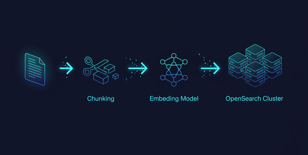 Here's what the indexing architecture looks like practically: documents arrive, get chunked with a small token overlap to preserve context boundaries, embedded via batch processing, and pushed to OpenSearch indices.