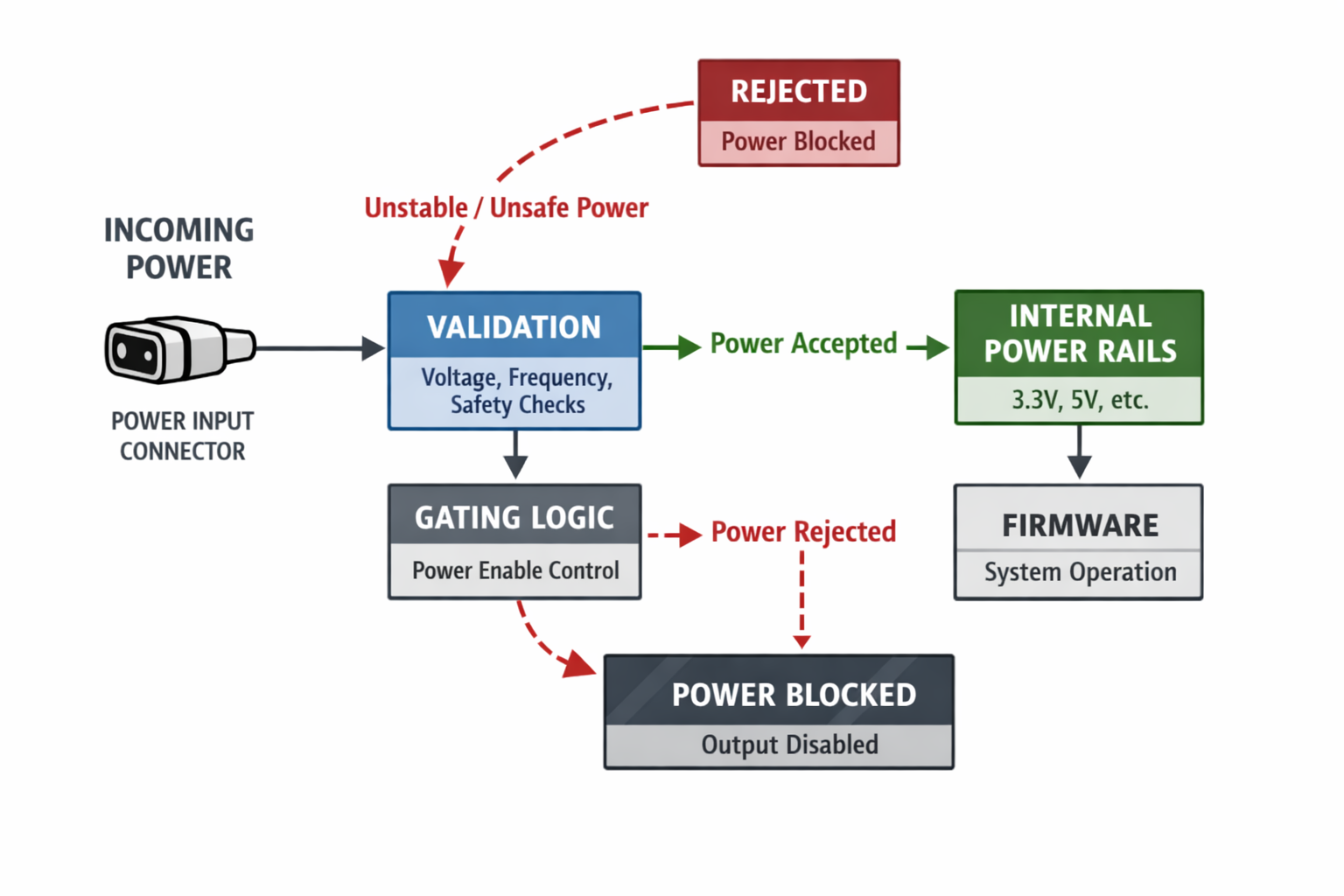 Crucially, this must work before firmware exists. If safe power depends on software configuration, then corrupted firmware becomes a physical risk—not just a functional one.