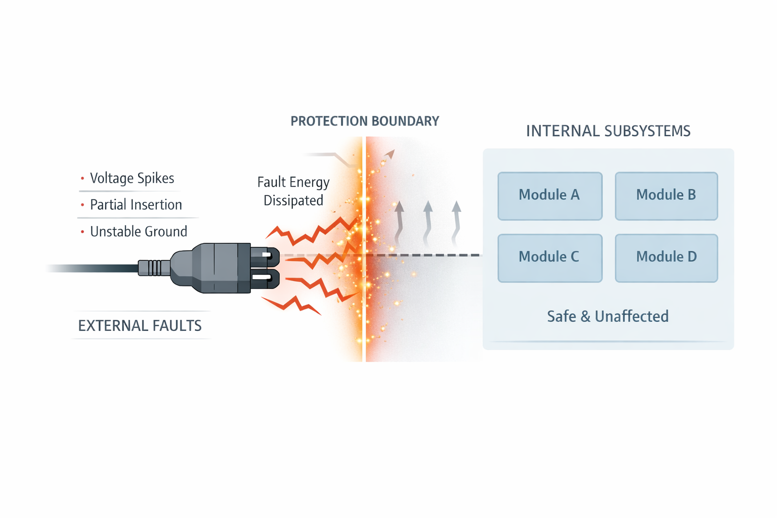 The first job of a shared connector is power entry. The mistake many systems make is treating incoming power as inherently valid.
