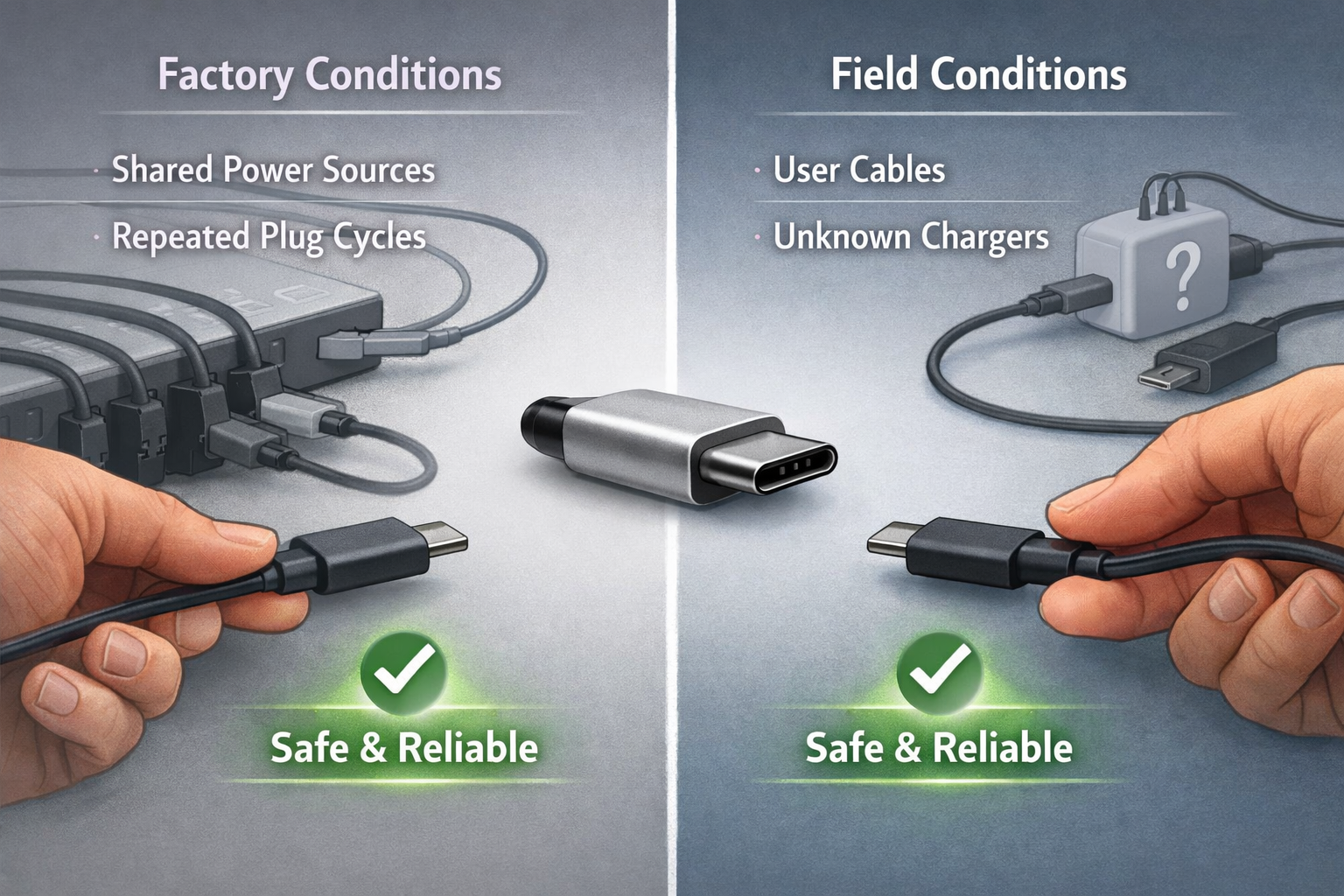 A connector that carries power, data, and trust must tolerate both worlds without requiring special handling or tribal knowledge.