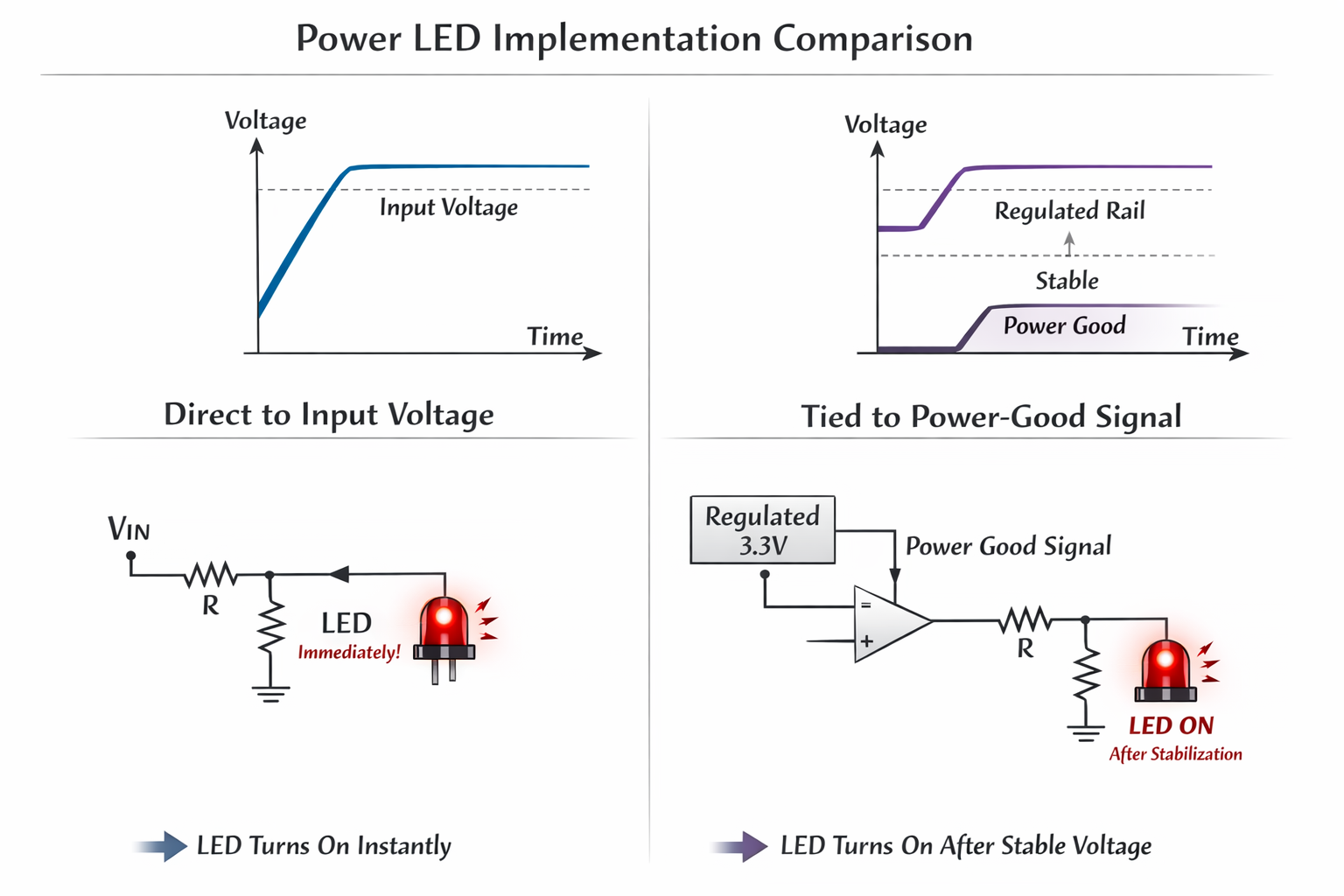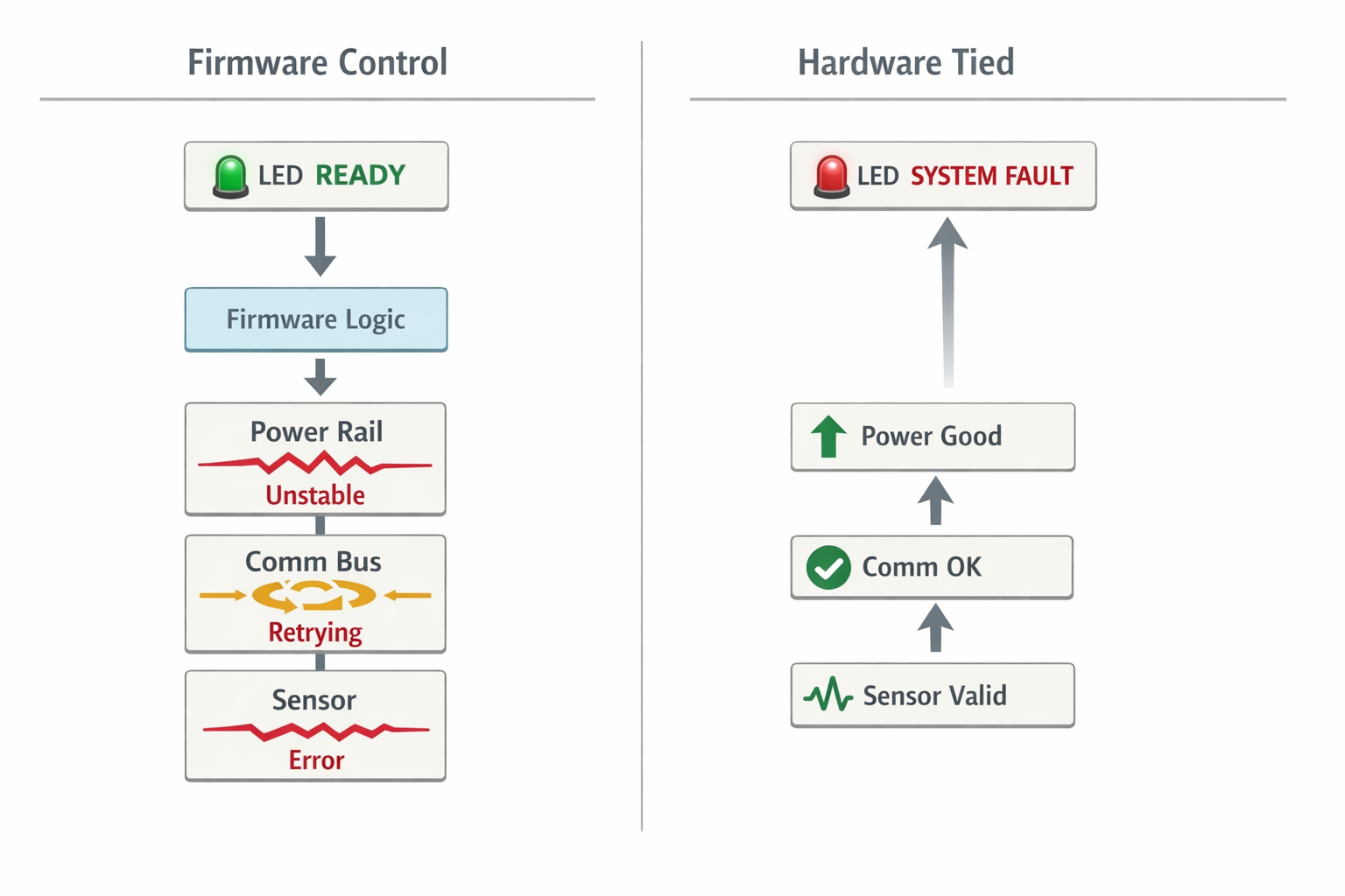 If an LED reflects actual rail validity instead of firmware assumption:
