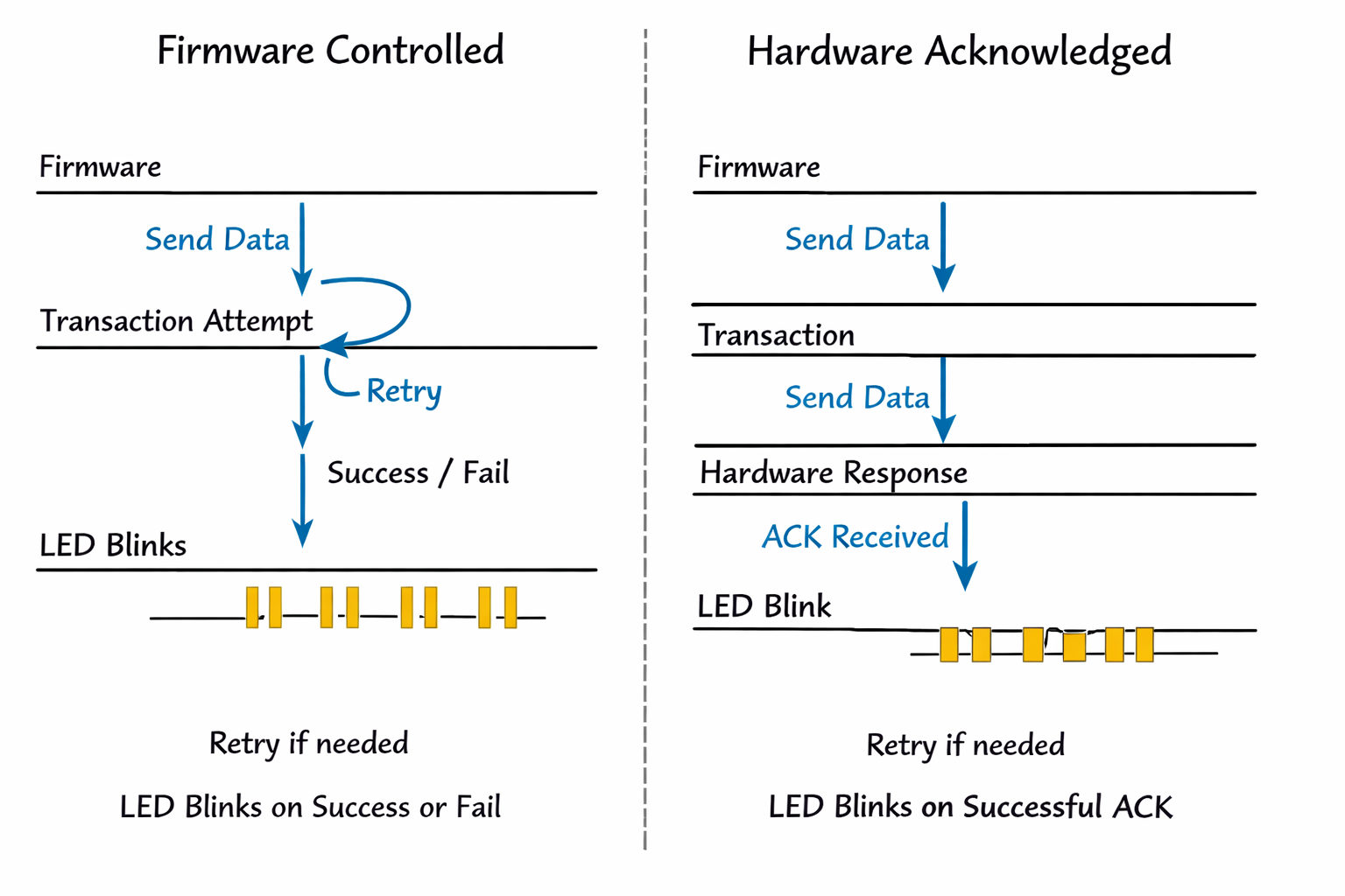 LED tied to firmware state machine that assumes success.