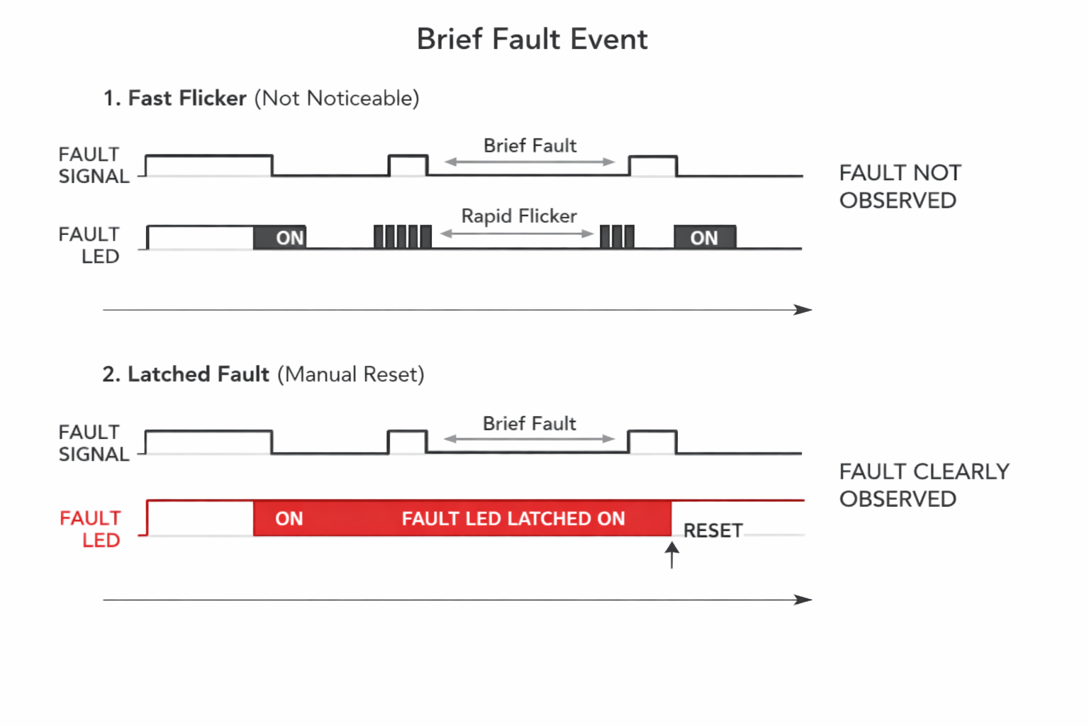 A fault LED that flickers briefly is useless.