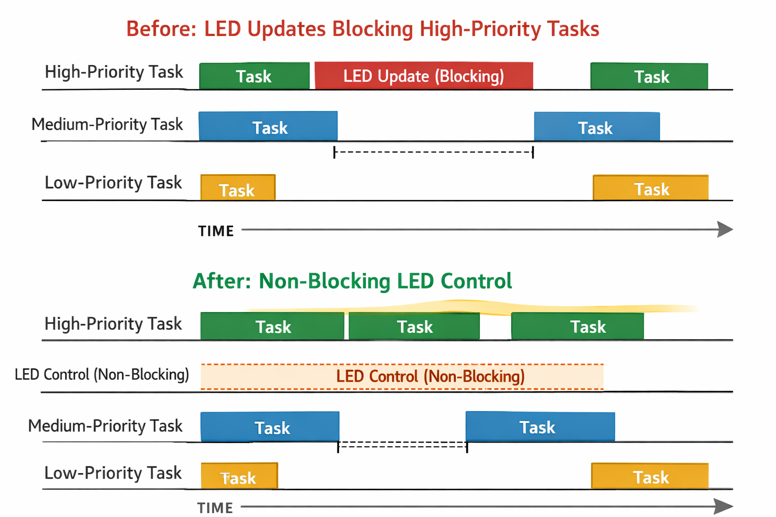 - LED updates occur in critical code paths.