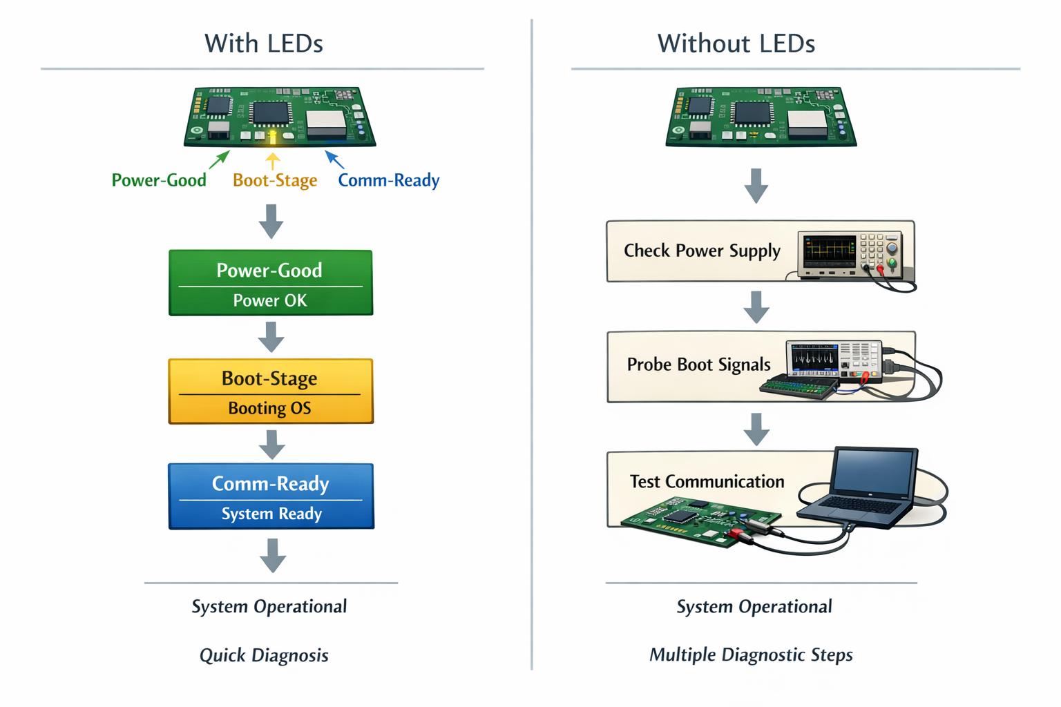 In early bring-up, LEDs can eliminate entire categories of ambiguity.